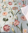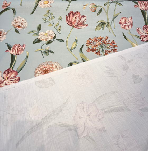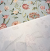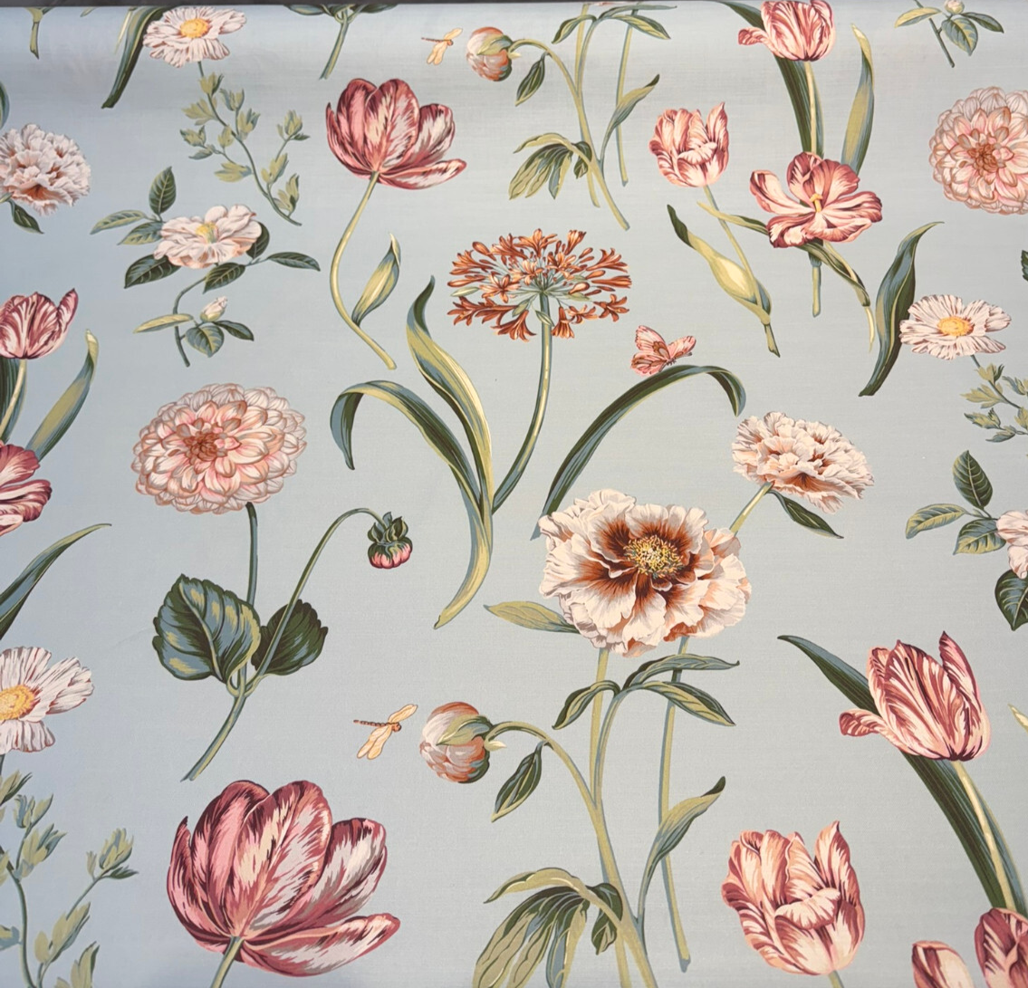 Waverly's Your Grace Lagoon features a romantic floral design in shades of fuchsia, red, soft orange, off-white, and muted green against a dusty teal blue background. Printed on a lightweight cotton basketweave, this fabric blends vintage charm with airy elegance—perfect for drapery, duvet covers, throw pillows, or light upholstery. Its soft texture and graceful pattern make it a timeless choice for home décor projects.
