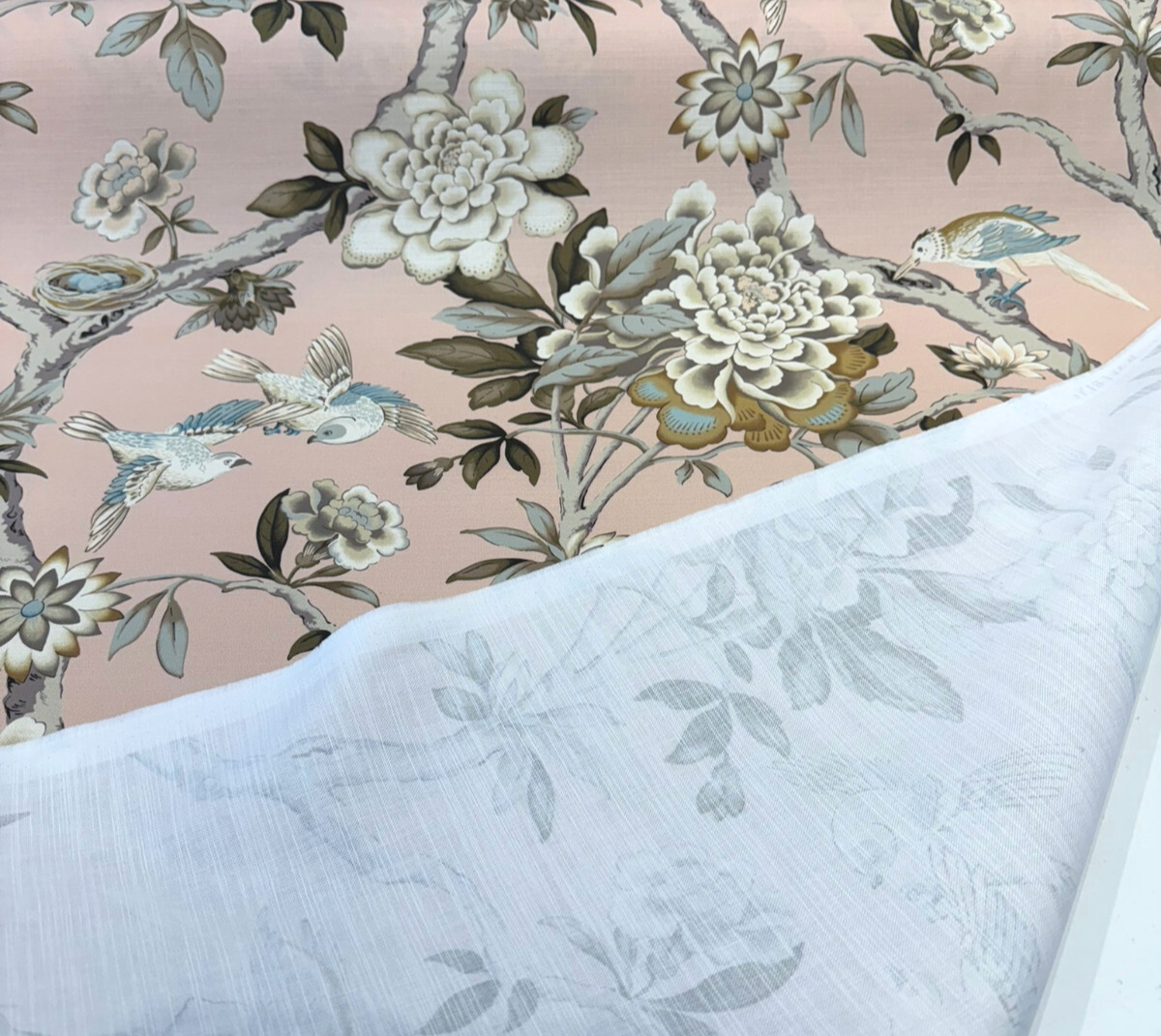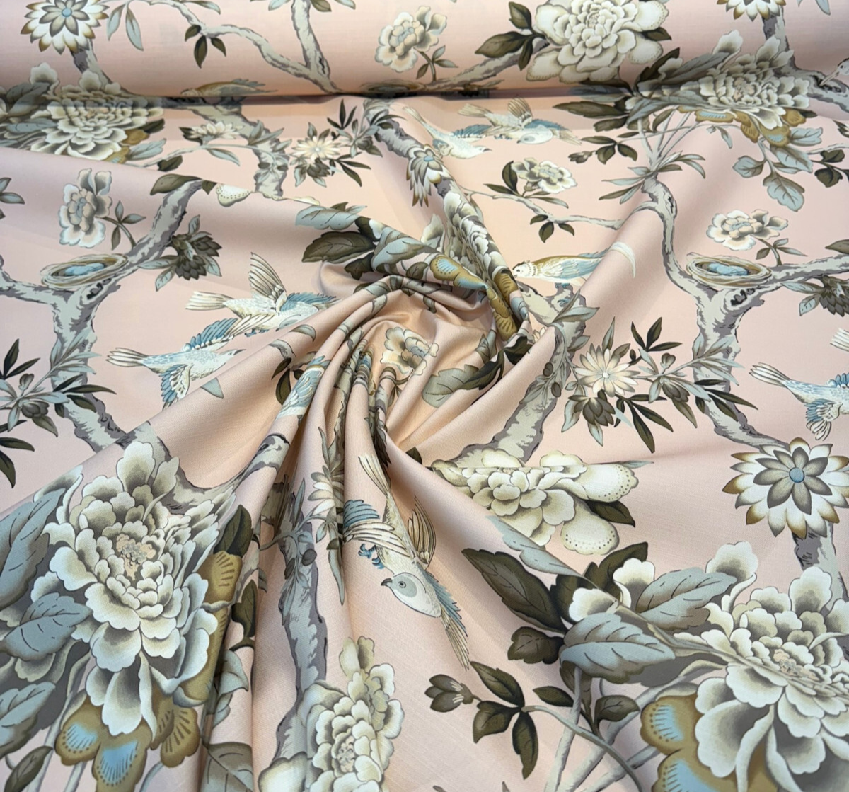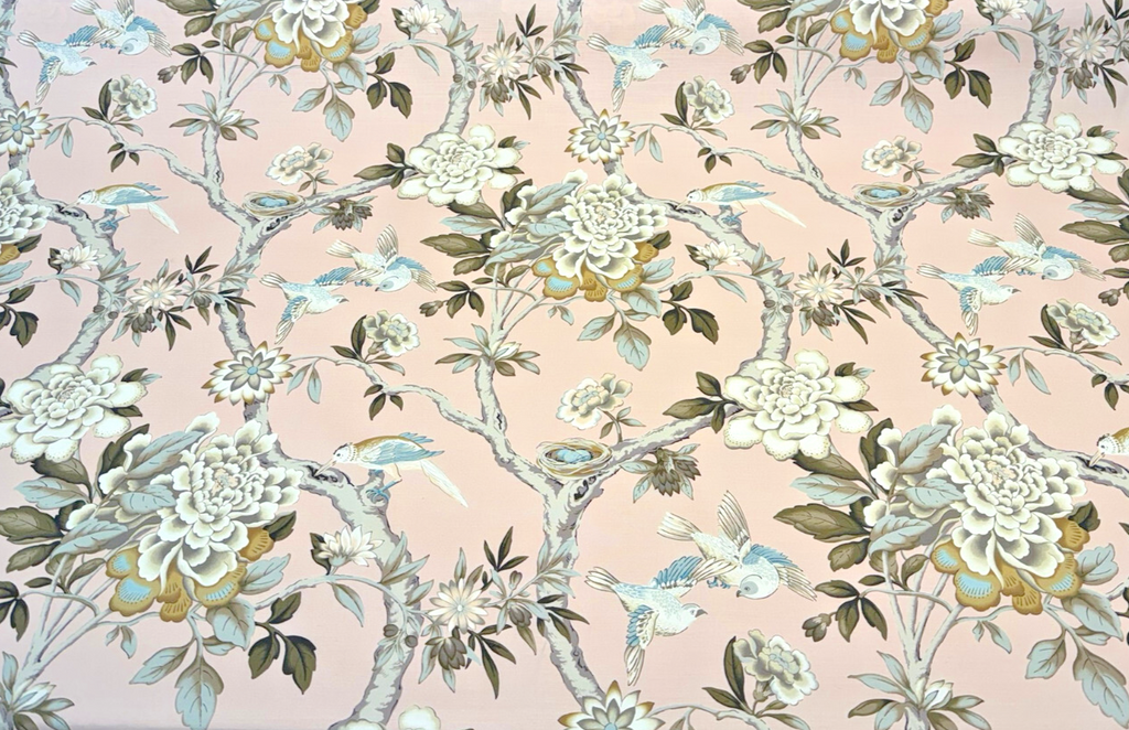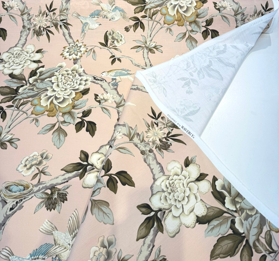 Waverly Mudan in Blush Pink is a romantic floral and bird print upholstery and drapery fabric that adds a soft yet sophisticated touch to any room. Set against a delicate blush pink background, this timeless botanical design features large blooming peonies, graceful tree branches, and serene birds in muted tones of ivory, taupe, sage green, and soft blue. Perfect for curtains, light upholstery, bedding, or statement cushions, this 100% cotton fabric is medium weight and finished with a Teflon coating for added durability and stain resistance.