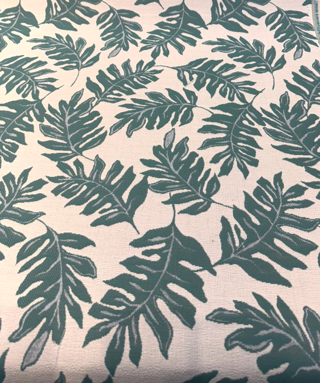 Sunbrella Frida Leaf Aquamarine Outdoor Upholstery Fabric is a tropical-inspired design featuring lush, detailed leaves in aquamarine on an white background. Crafted with Sunbrella’s 100% solution-dyed acrylic, this fabric offers exceptional durability with resistance to fading, stains, mildew, and water. The versatile design makes it ideal for outdoor and indoor applications such as patio cushions, lounge chairs, pillows, drapery, and marine seating.
