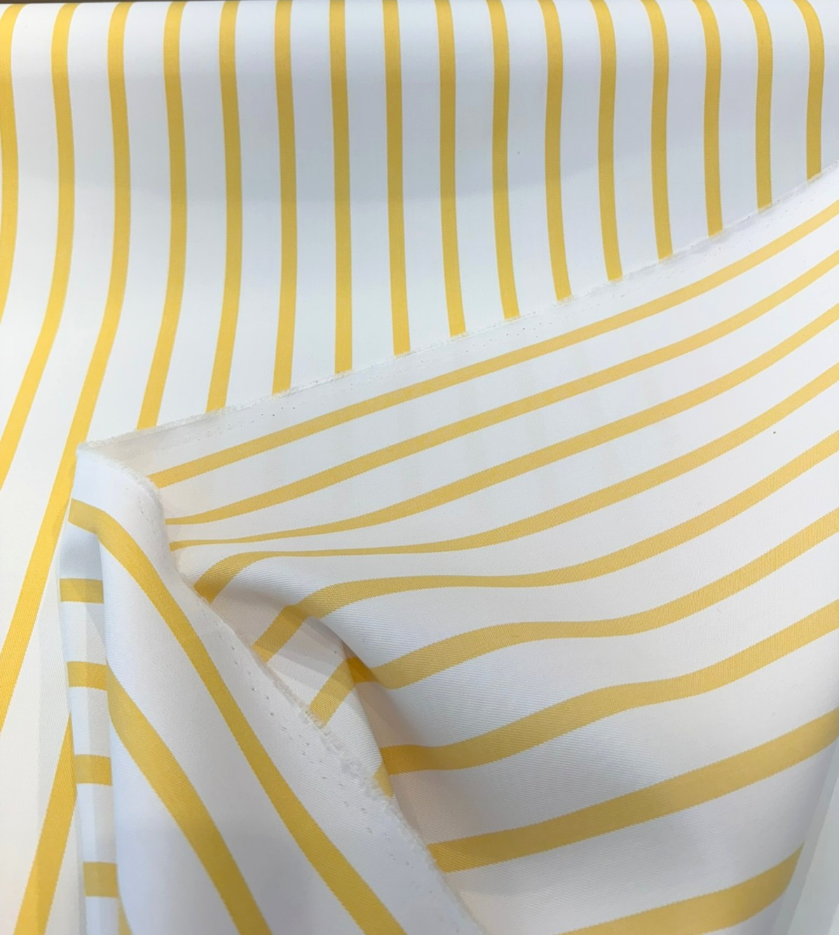 Brighten up your indoor or outdoor living space with the cheerful elegance of Sunbrella Lido Buttercup. This crisp white and sunny yellow stripe adds a timeless coastal vibe to patios, poolside seating, boat cushions, and interior décor.