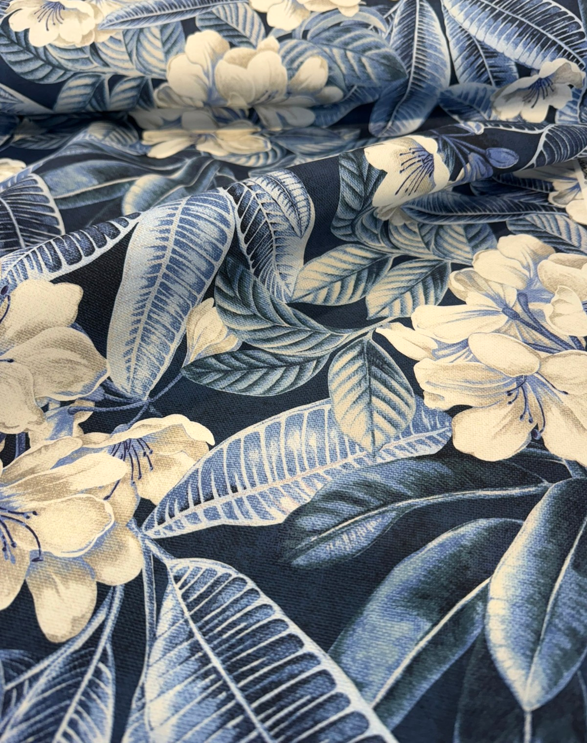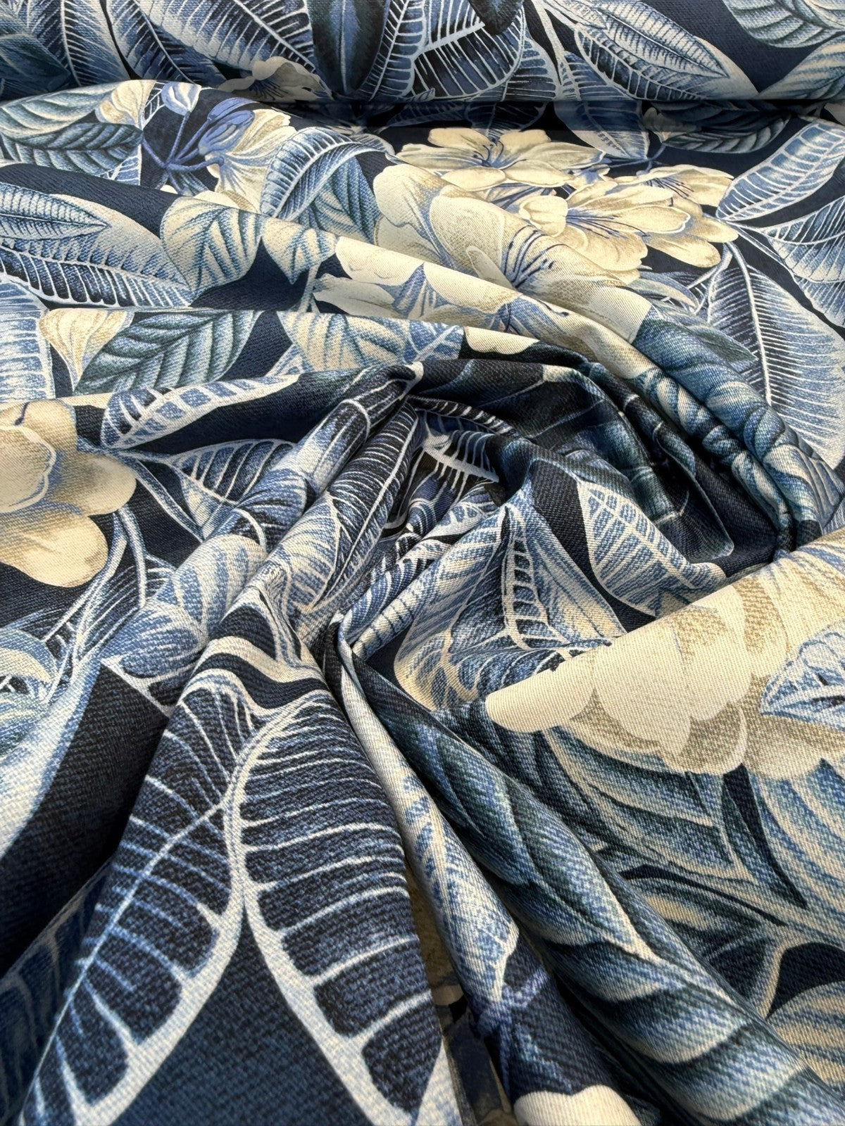 Give your space a relaxed island feel with Darwin Flora Midnight Blue from Tommy Bahama Home. This multipurpose print layers painterly tropical leaves and creamy florals over a deep navy ground, blending Sky Blue, Navy, Off-White, and Oyster tones. Printed on soft, durable 100% cotton, it’s a standout for curtains, furniture, pillows, headboards, cornices, and bedding accents.