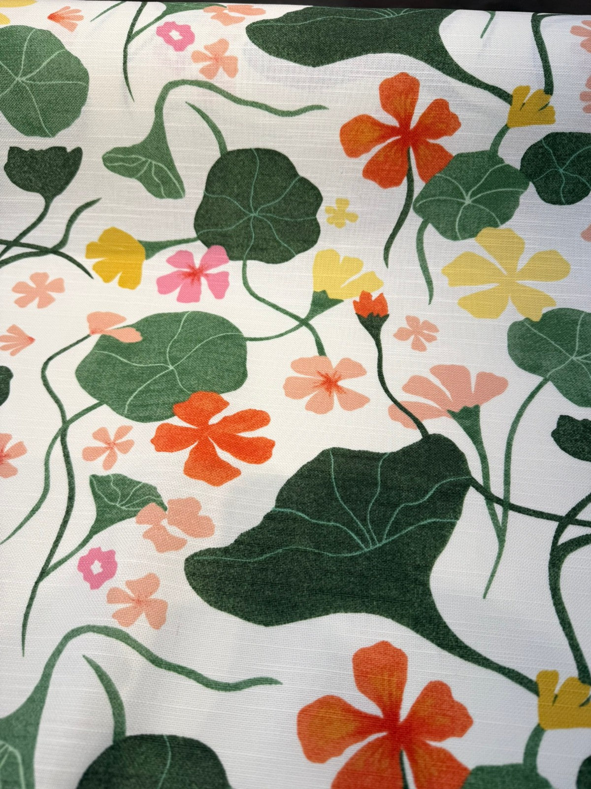 Nasturtiums Nectar by Elana Gabrielle for P/K Lifestyles is a fresh, botanical print inspired by wild and cultivated edible and medicinal plants. This cheerful floral design features flowing vines and stylized nasturtium blossoms in green, coral, sun yellow, pink, and fern, set against a soft eggshell background.