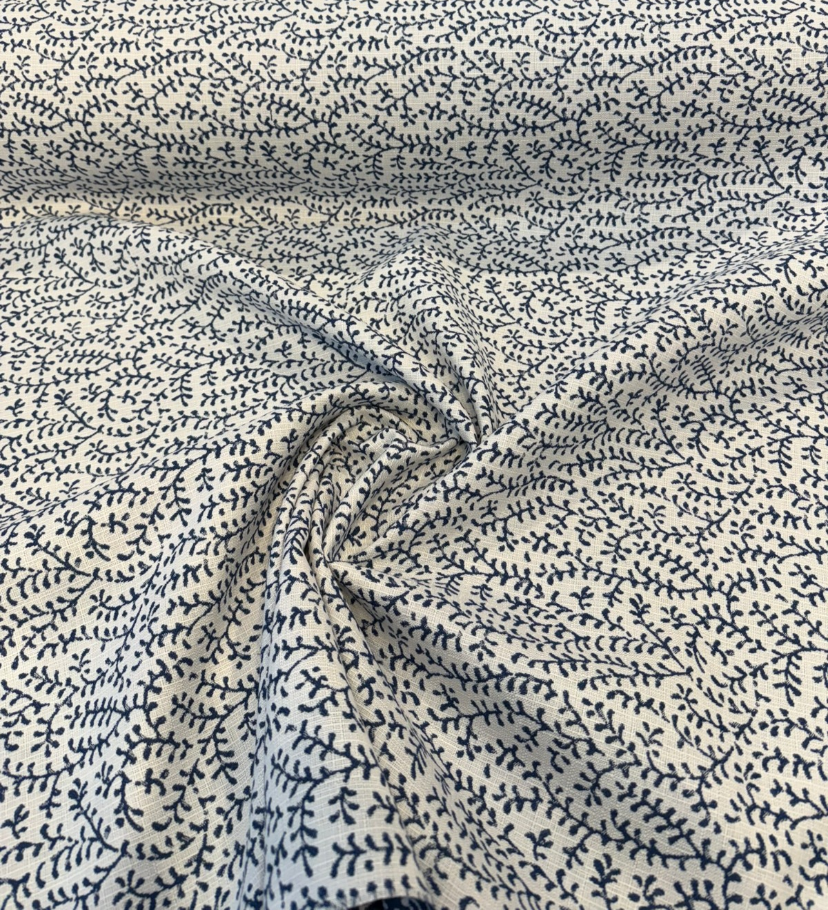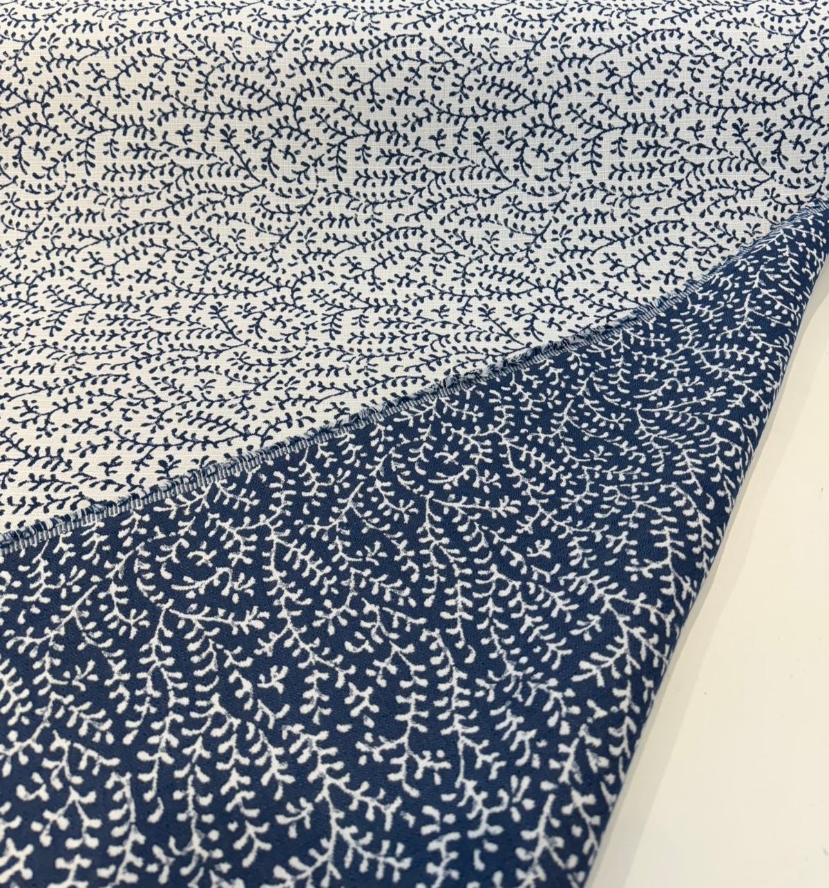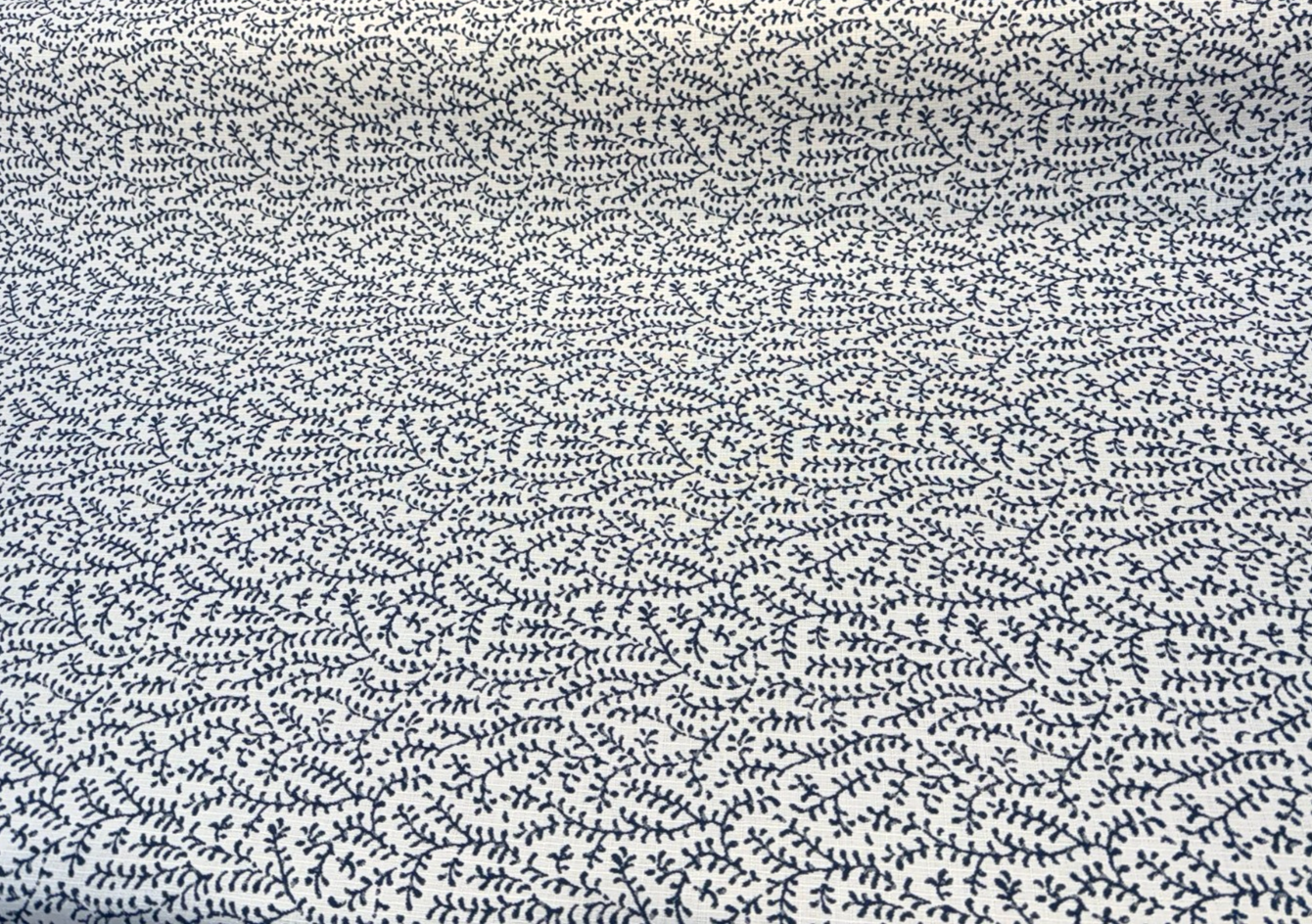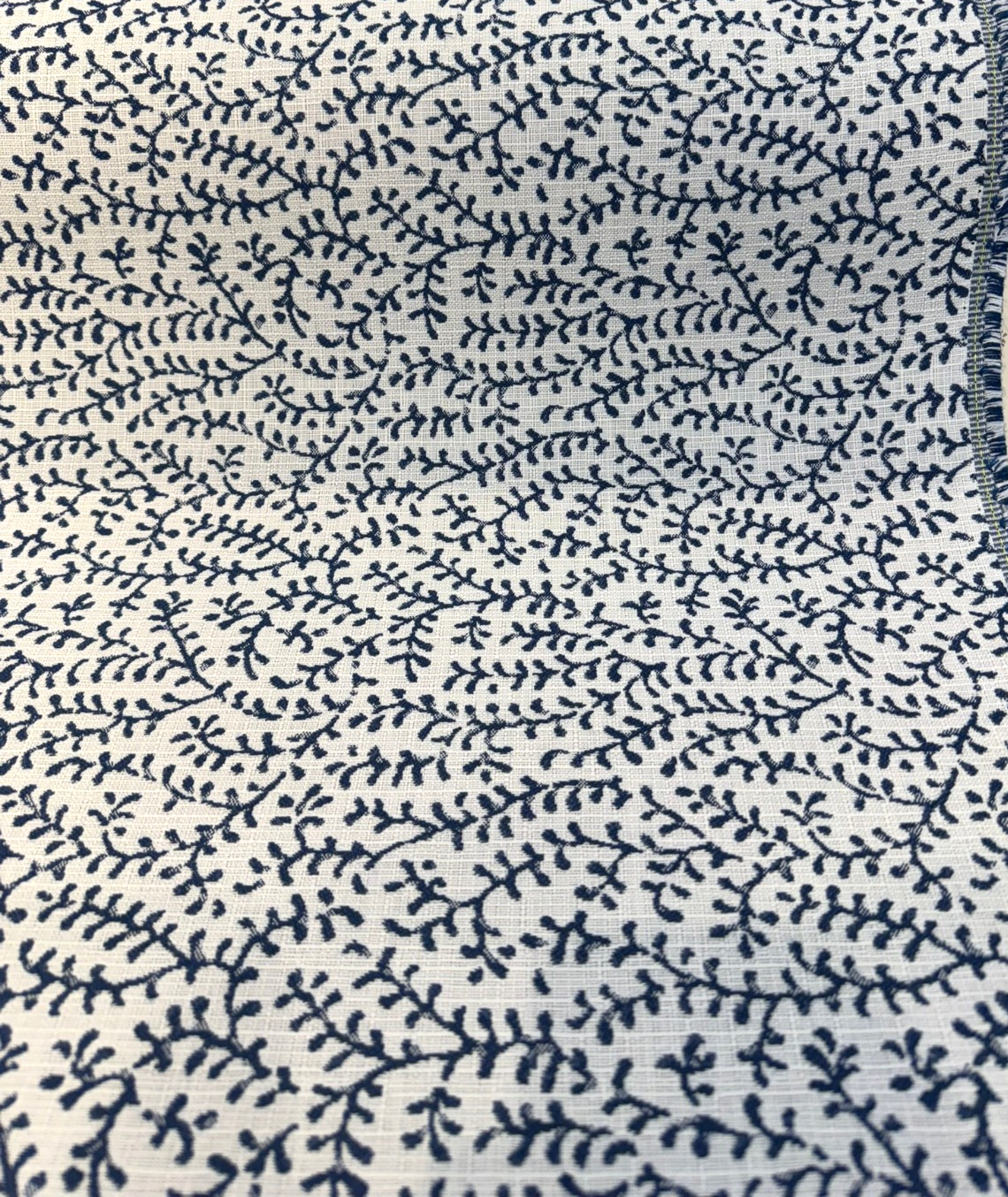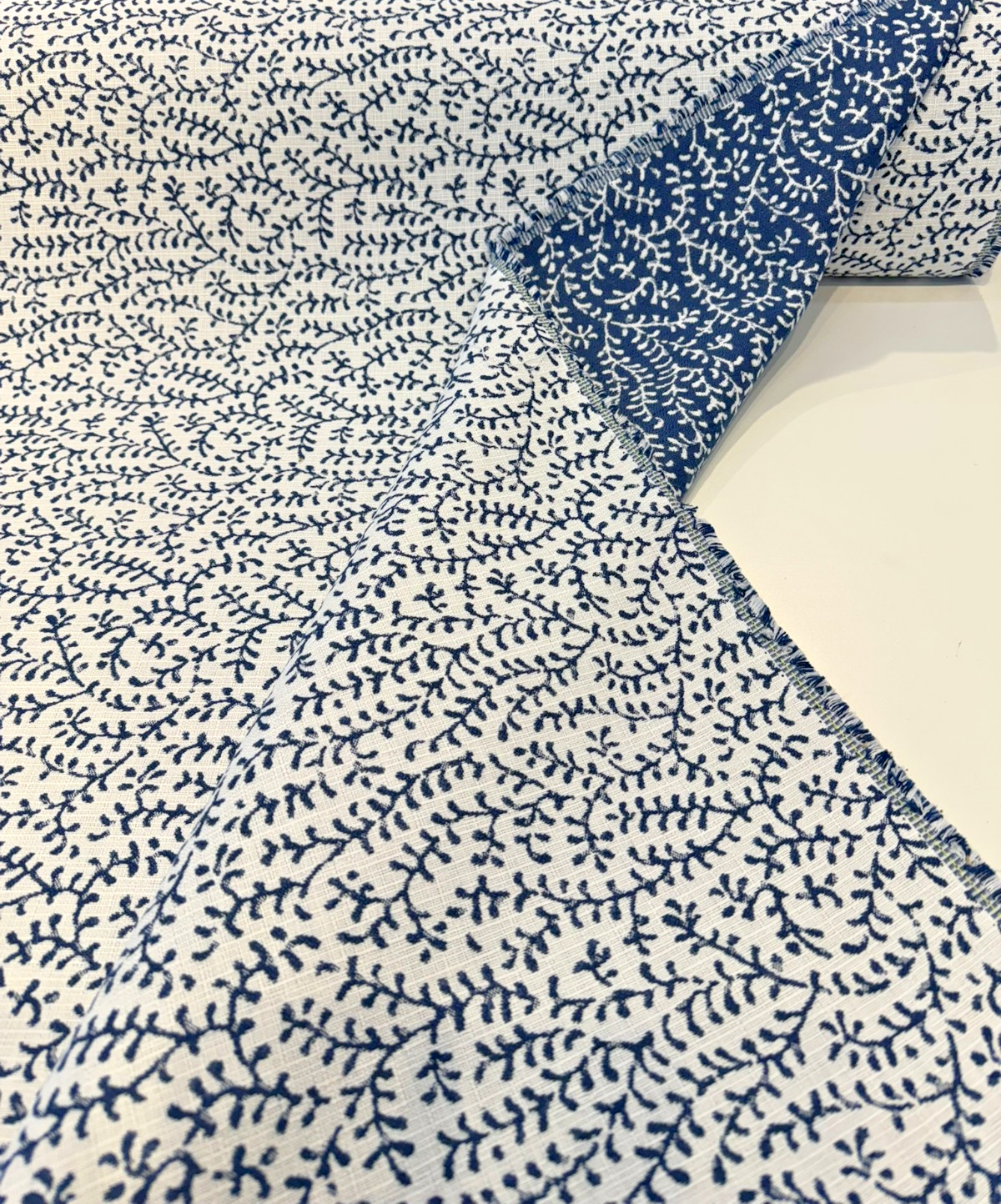 Sunbrella Eberly Peacock is a striking, reversible botanical fabric from the Sunbrella Fusion Collection. This 54" wide performance fabric features a bold, deep peacock blue base with white vine motifs on one side, and a reversed ivory-and-blue pattern on the other — giving you two design options in one. Its printed vine pattern evokes a modern, organic aesthetic perfect for indoor or outdoor use.