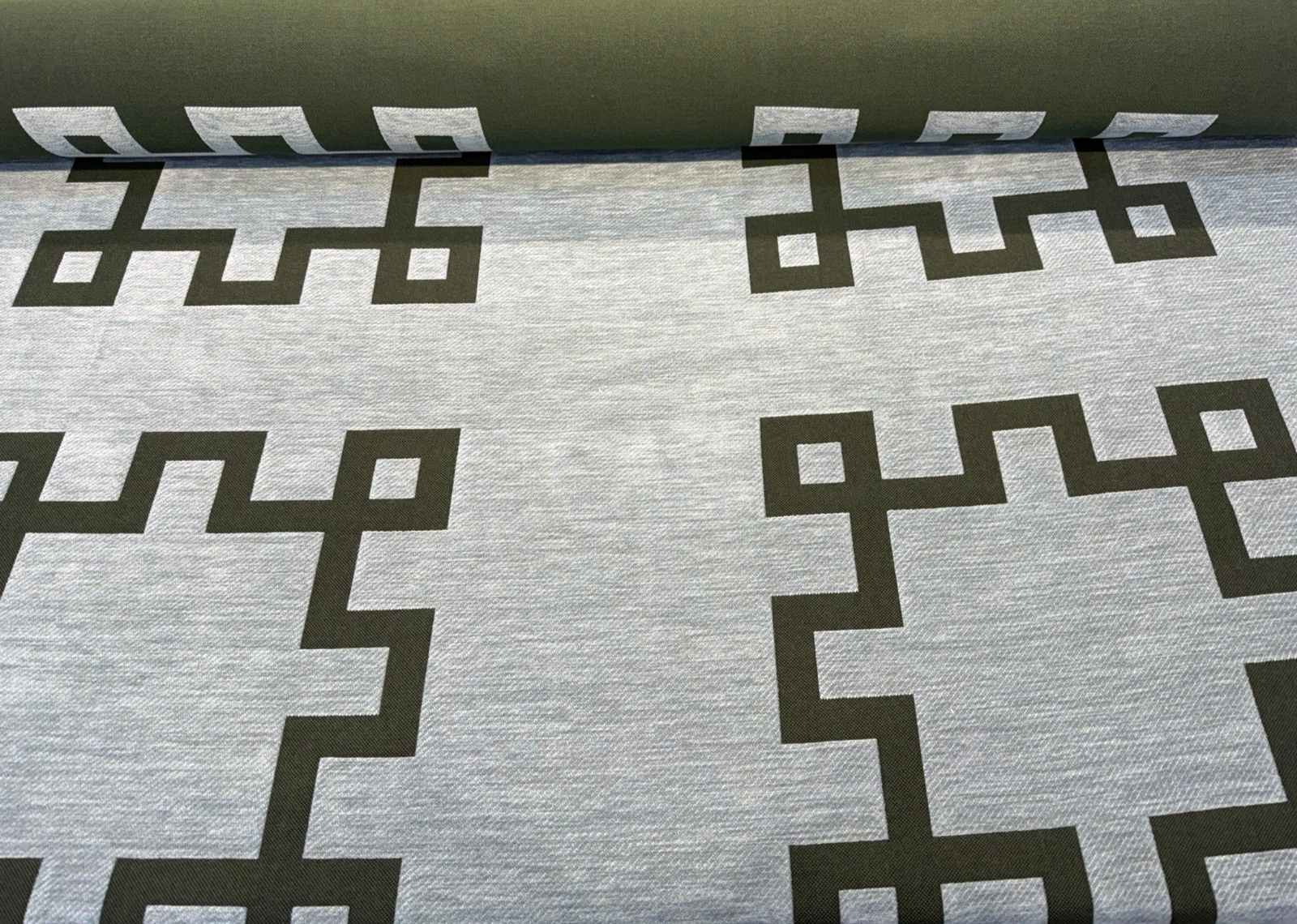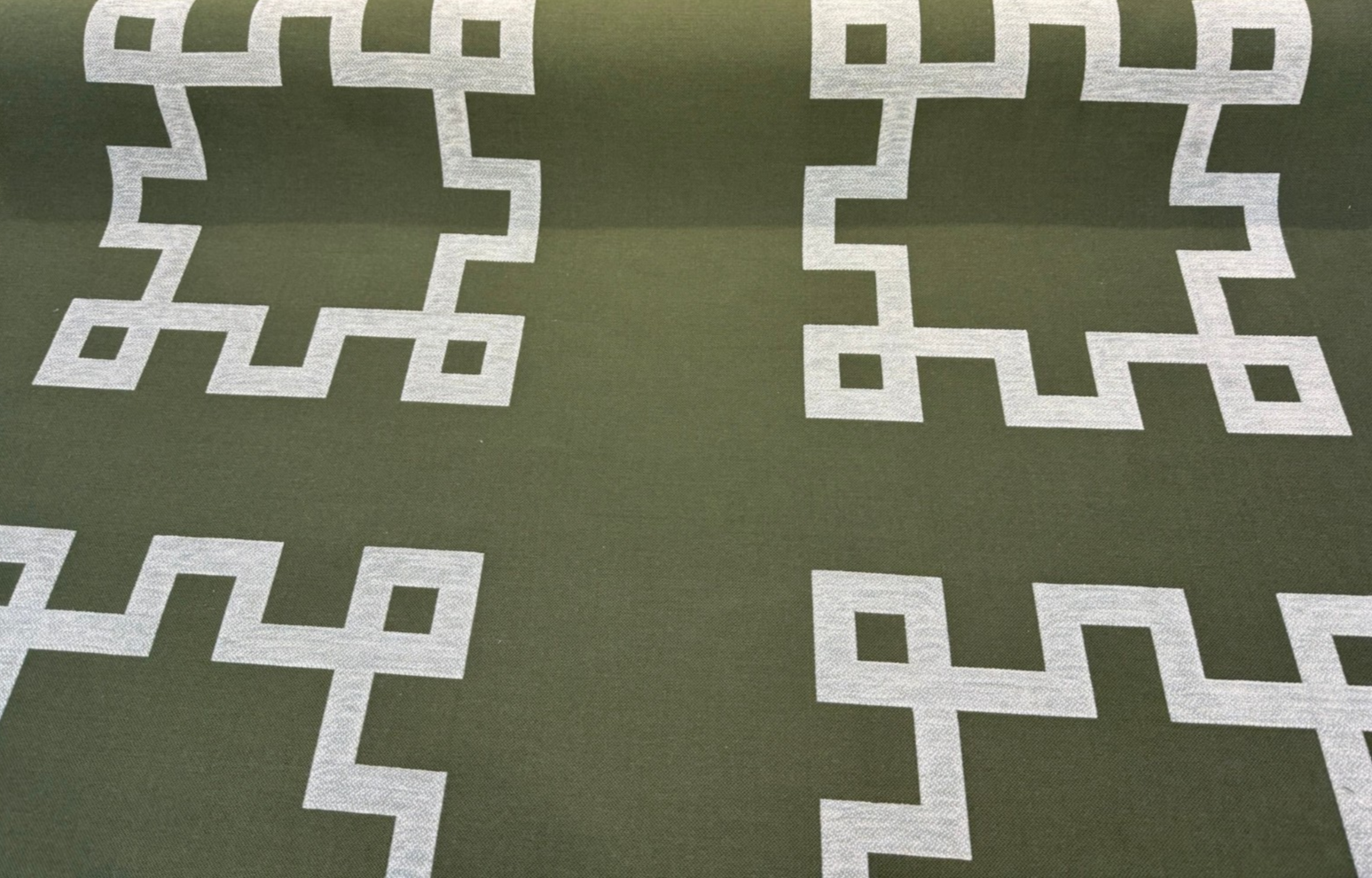 Sunbrella Greco II Green Kelp is a rich, nature-inspired geometric upholstery fabric featuring a bold Greek-key style pattern in forest green with a soft light blue design. The reversible construction offers two versatile looks—one side showcasing the light blue motif on green, and the reverse highlighting green on a light blue background.