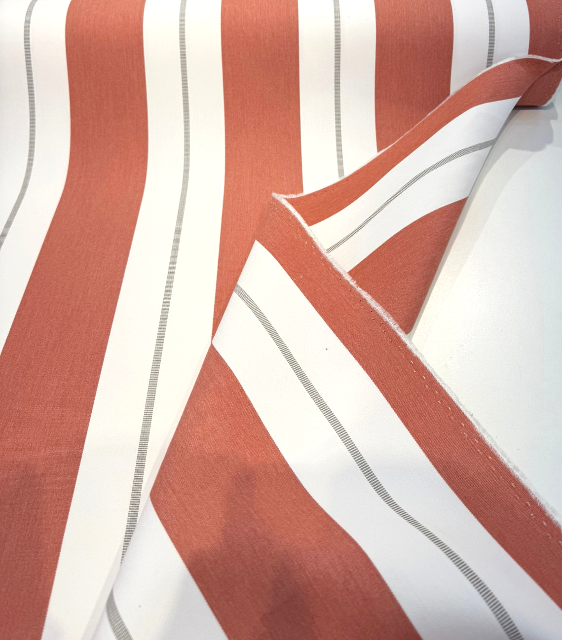 Bring warmth and timeless style to your indoor or outdoor space with Sunbrella Relate Terracotta (57017-0005). Featuring bold terracotta stripes contrasted by clean white bands and subtle gray accents, this updated classic stripe makes a stylish statement on patio cushions, drapery, and upholstery.