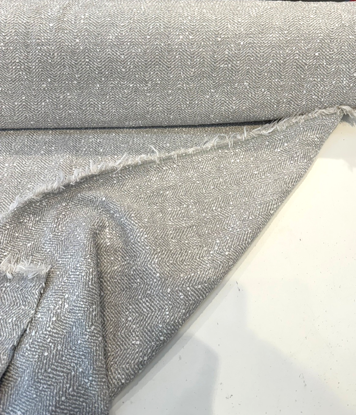 Bring texture and timeless elegance to your outdoor or indoor space with Sunbrella Boucle Vincent in Gray White Cloud 305479-0002. This luxuriously soft yet durable upholstery fabric features a subtle zigzag texture woven in a soft gray tone with speckled white boucle accents, giving it a cloud-like feel and a rich, organic appearance.