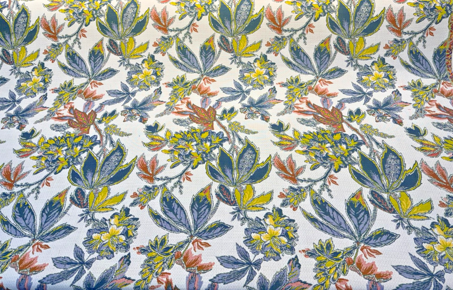 A crisp white background highlights a stunning palette of deep navy blue, denim blue, golden yellow, moss green, sage, burnt orange, and soft coral — making this pattern perfect for brightening patios, poolside seating, sunrooms, or coastal interiors.