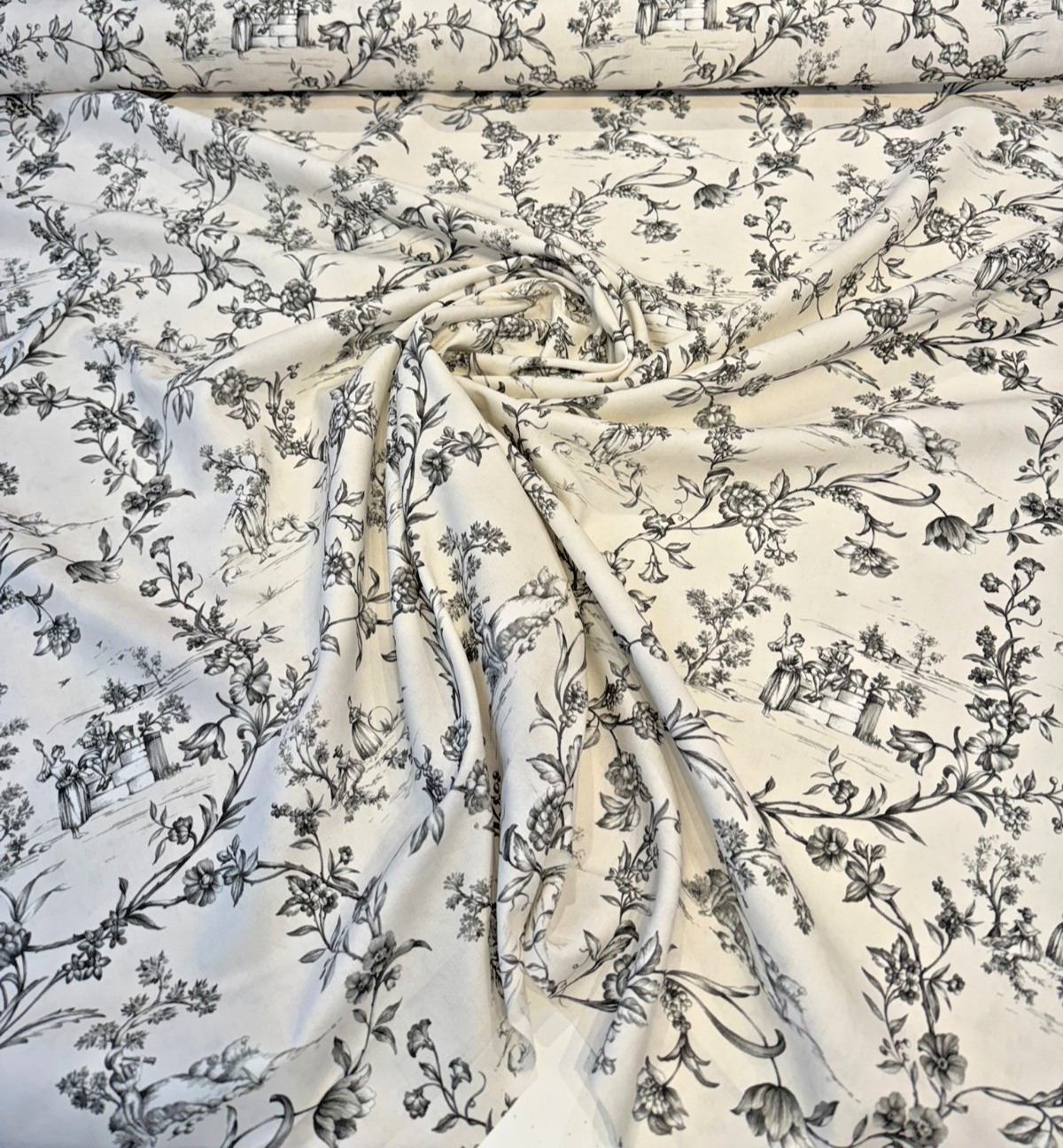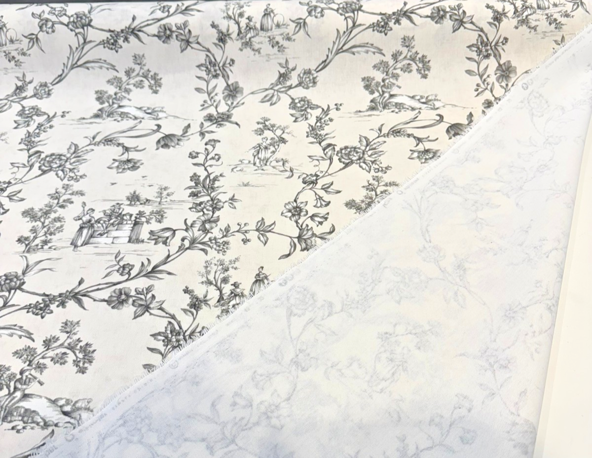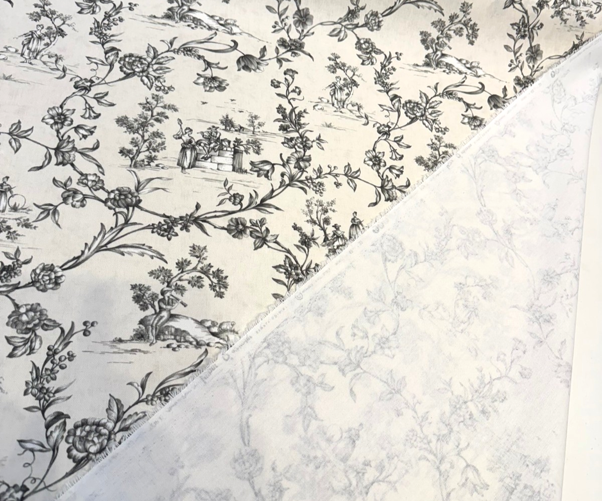 Classic elegance meets countryside charm in this Black and White Toile Scenic Floral Fabric. Printed on 100% cotton with a soft drape, this fabric features a timeless pastoral toile motif in rich black on a natural white background. Ideal for drapery, pillows, upholstery, slipcovers, and decorative accents, this fabric brings French cottage charm into any space.