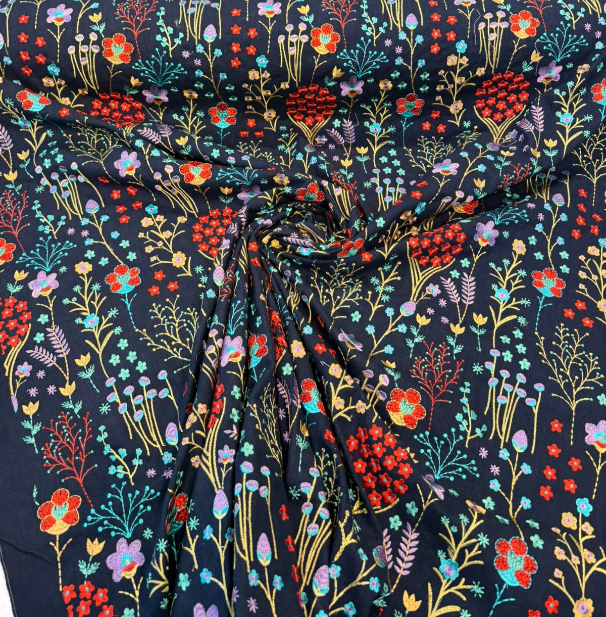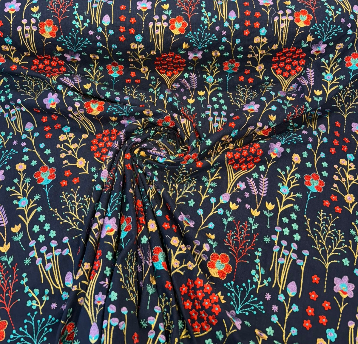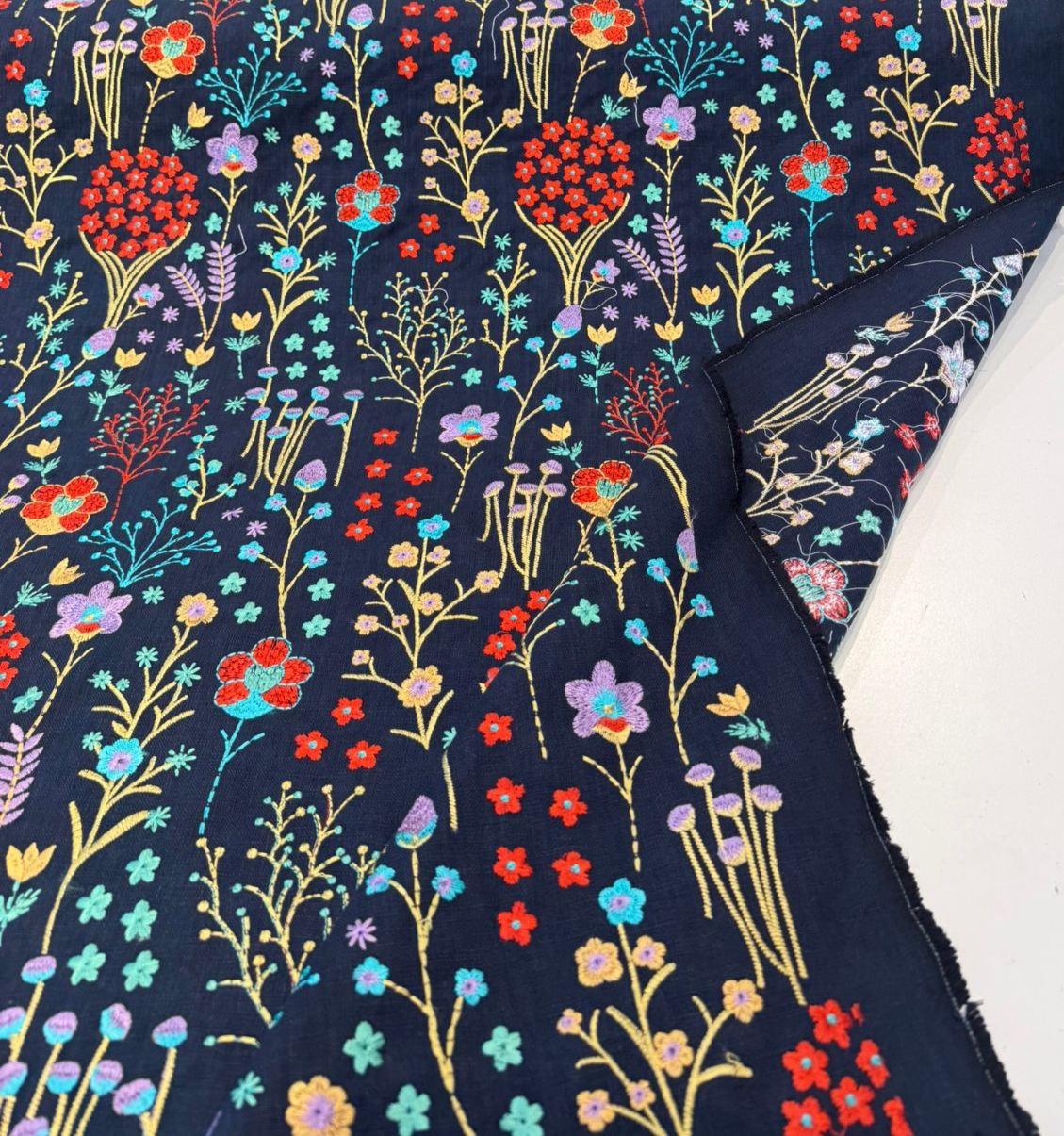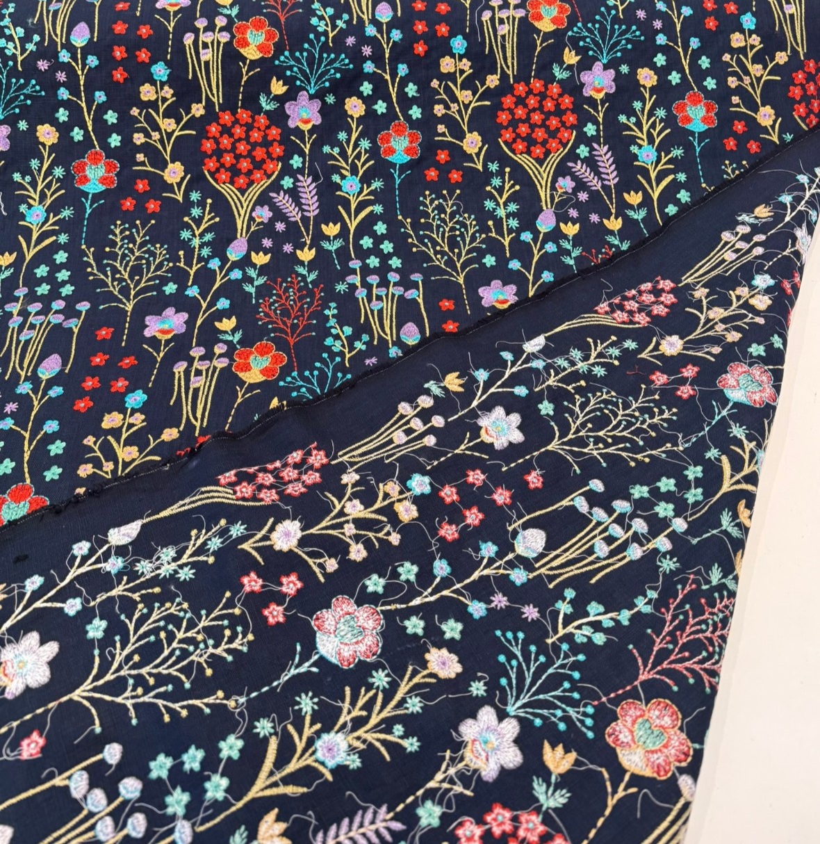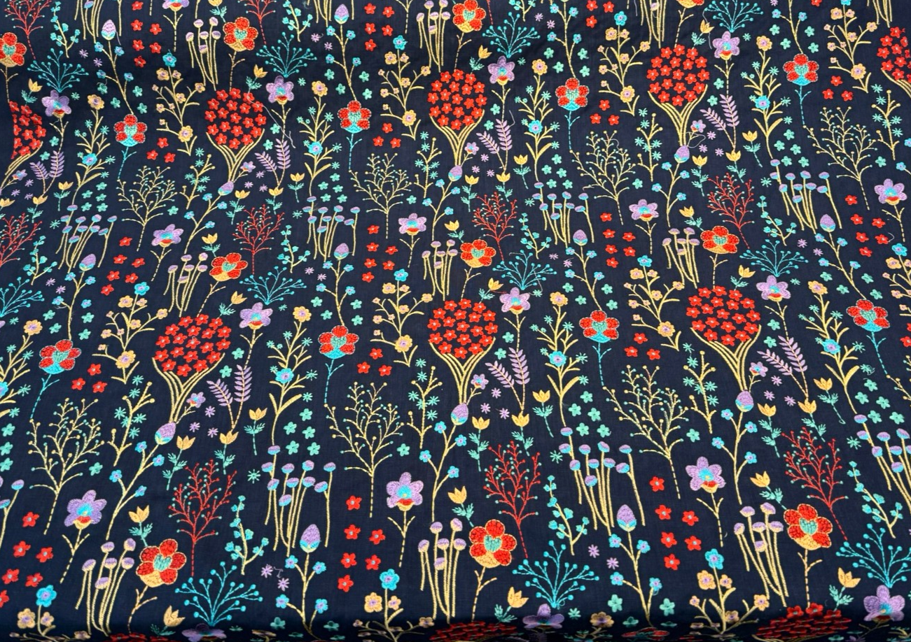 This richly detailed design features vibrant florals and botanical stems delicately embroidered.The embroidery isn't printed — it's tightly stitched using 100% viscose threads, giving each flower a raised texture and soft, silky sheen that adds dimension and luxury. Whether you're designing drapery panels, headboards, statement pillows, or accent pieces, this fabric creates an upscale, artisan-crafted look.