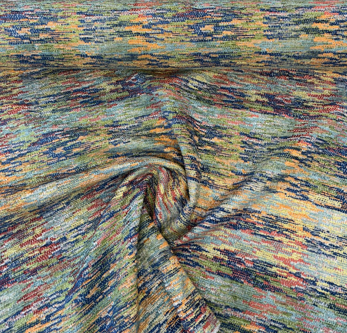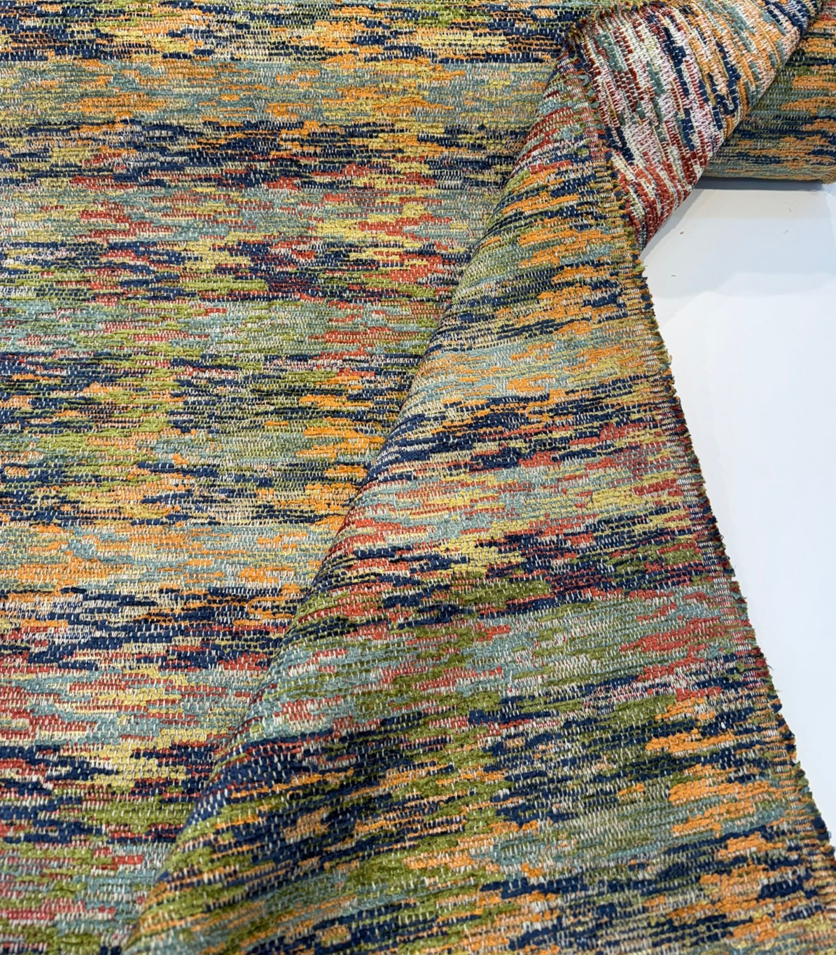 Karoo Belgian Multicolor Chenille Upholstery Fabric is a richly woven textile featuring a vibrant, dimensional pattern inspired by traditional ikat and tribal designs. The fabric blends a beautiful palette of teal, navy blue, aqua, golden yellow, rust, sage green, and soft neutral tones, creating a dynamic yet balanced look that adds character and warmth to furniture.