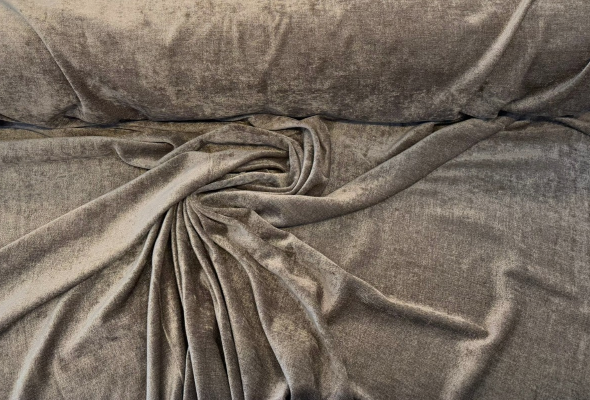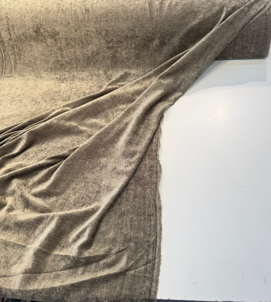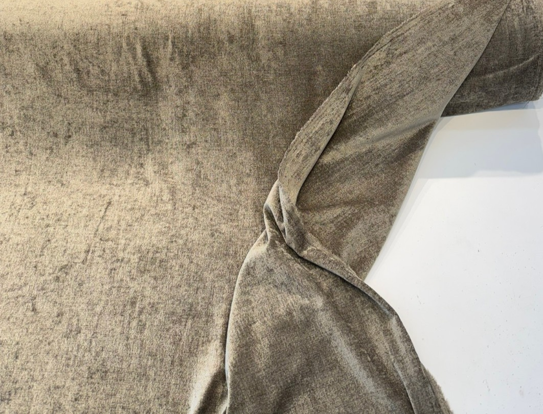 Monroe Driftwood is a rich, velvety chenille upholstery fabric featuring a soft taupe color with subtle tonal variation that gives it a natural, lived-in elegance. The surface has a gentle sheen and a plush hand, creating a luxurious look that shifts beautifully with light and movement. Its driftwood-inspired tone blends warm beige and soft gray undertones, making it incredibly versatile across a wide range of interiors.