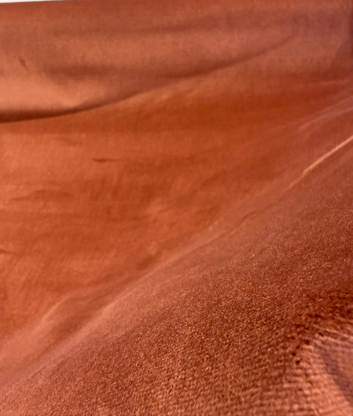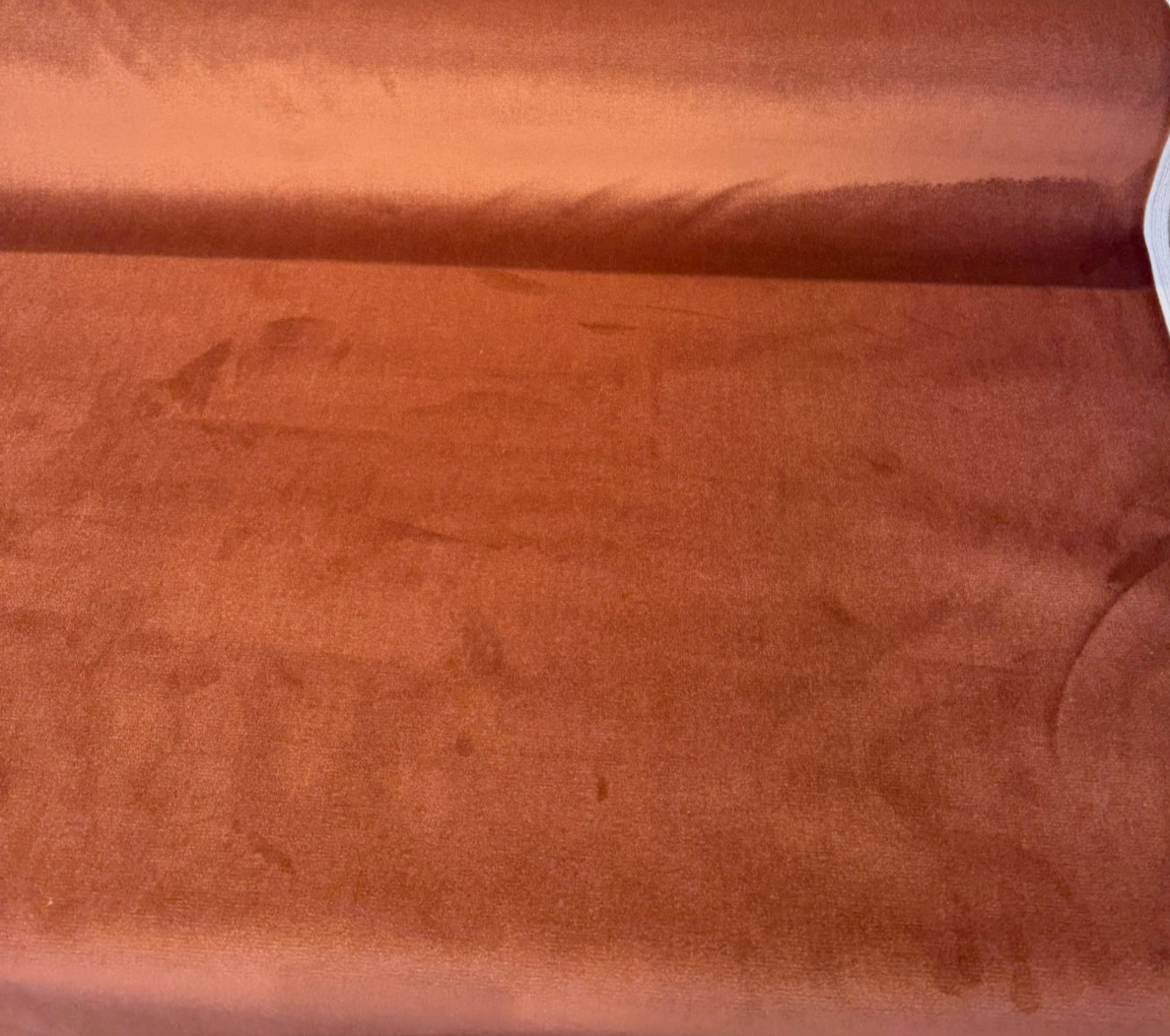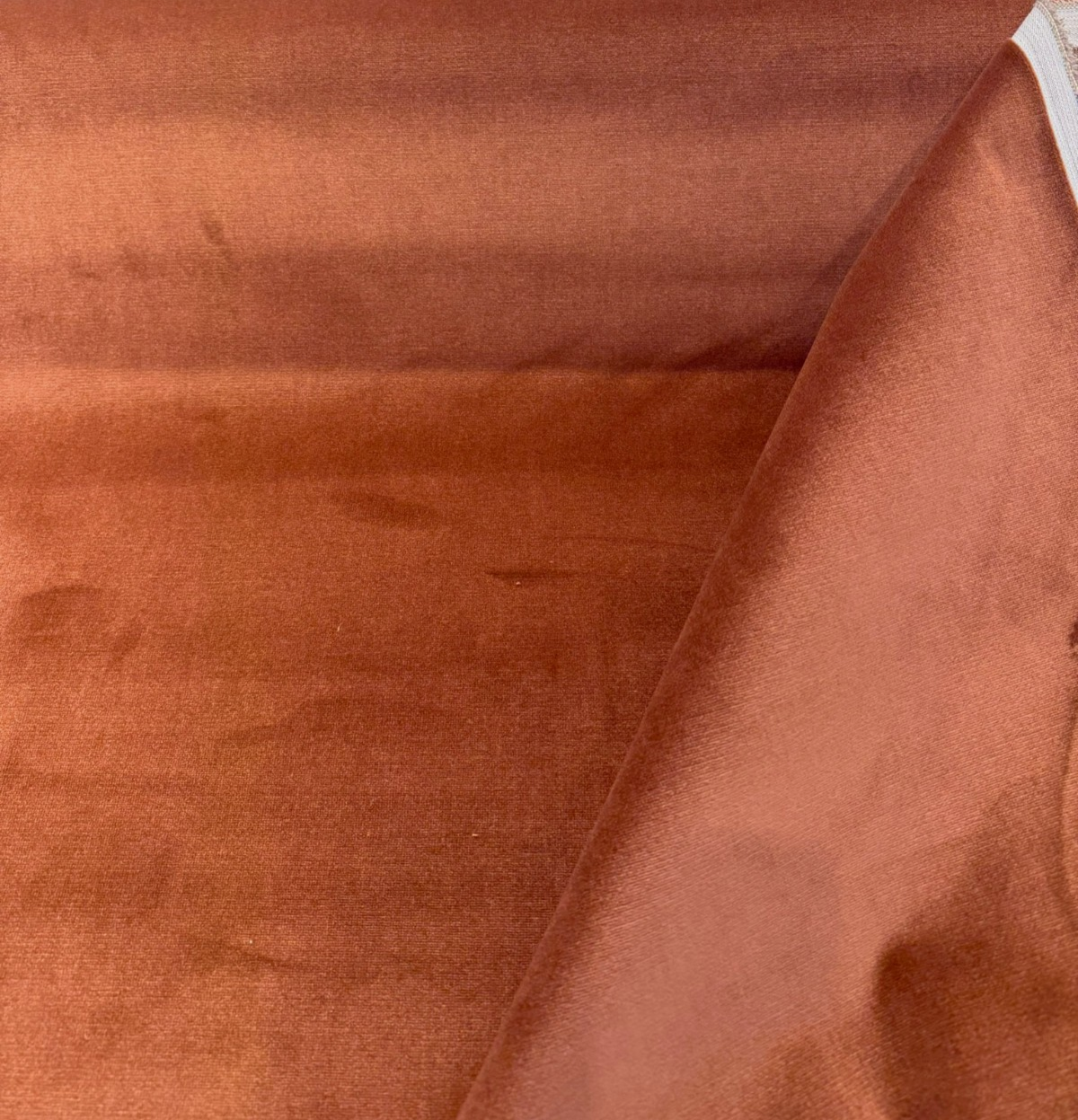 Bring the warmth of sun-baked earth into your interiors with P Kaufmann's Senet Velvet in Blush Terracotta — a sumptuously soft, plain velvet that glows with the rich, earthy tones of fired clay, canyon rust, and aged cognac. The color shifts beautifully depending on the light: a brighter copper-rose when the pile catches direct sun, deepening to a moody burnt sienna in shadow. It's a color that feels equally at home in a maximalist, globally-inspired living room and a warm, earthy minimalist bedroom.
