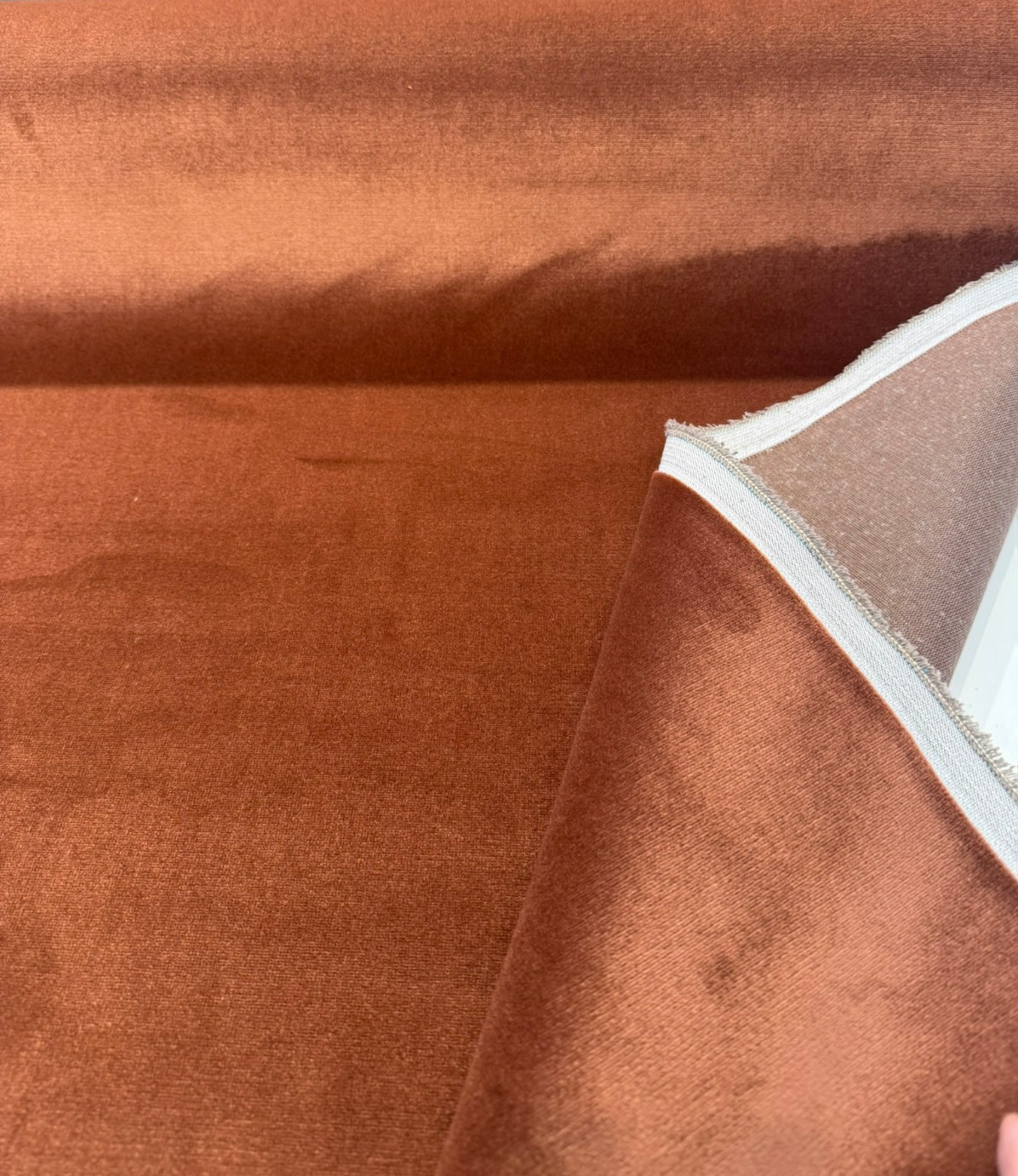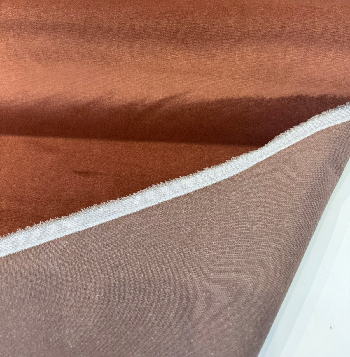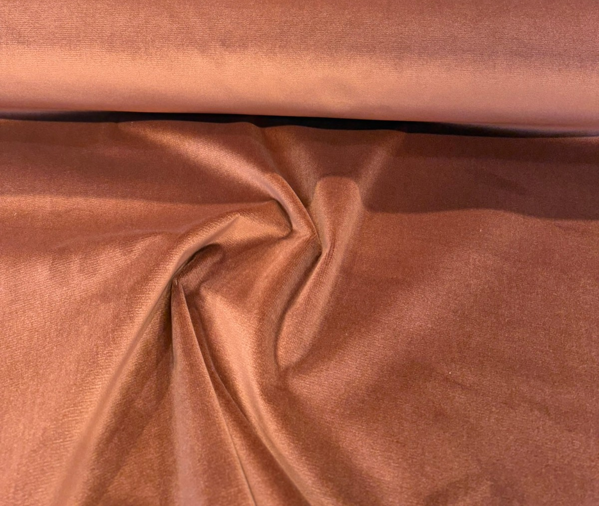 Bring the warmth of sun-baked earth into your interiors with P Kaufmann's Senet Velvet in Blush Terracotta — a sumptuously soft, plain velvet that glows with the rich, earthy tones of fired clay, canyon rust, and aged cognac. The color shifts beautifully depending on the light: a brighter copper-rose when the pile catches direct sun, deepening to a moody burnt sienna in shadow. It's a color that feels equally at home in a maximalist, globally-inspired living room and a warm, earthy minimalist bedroom.