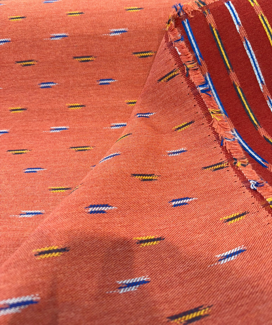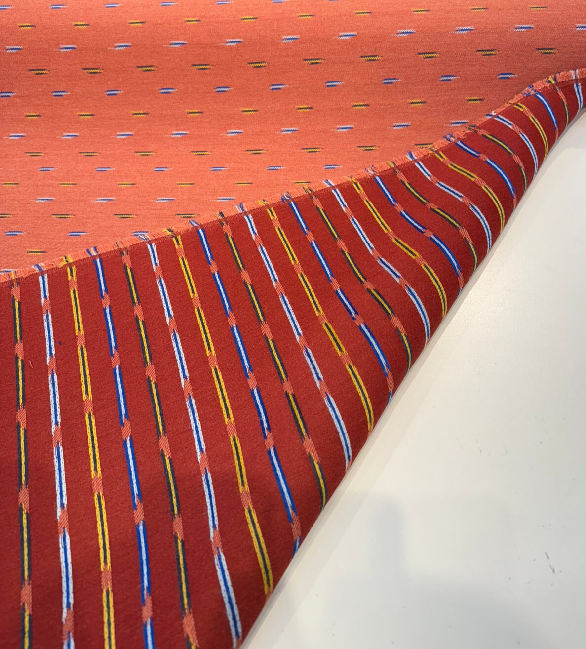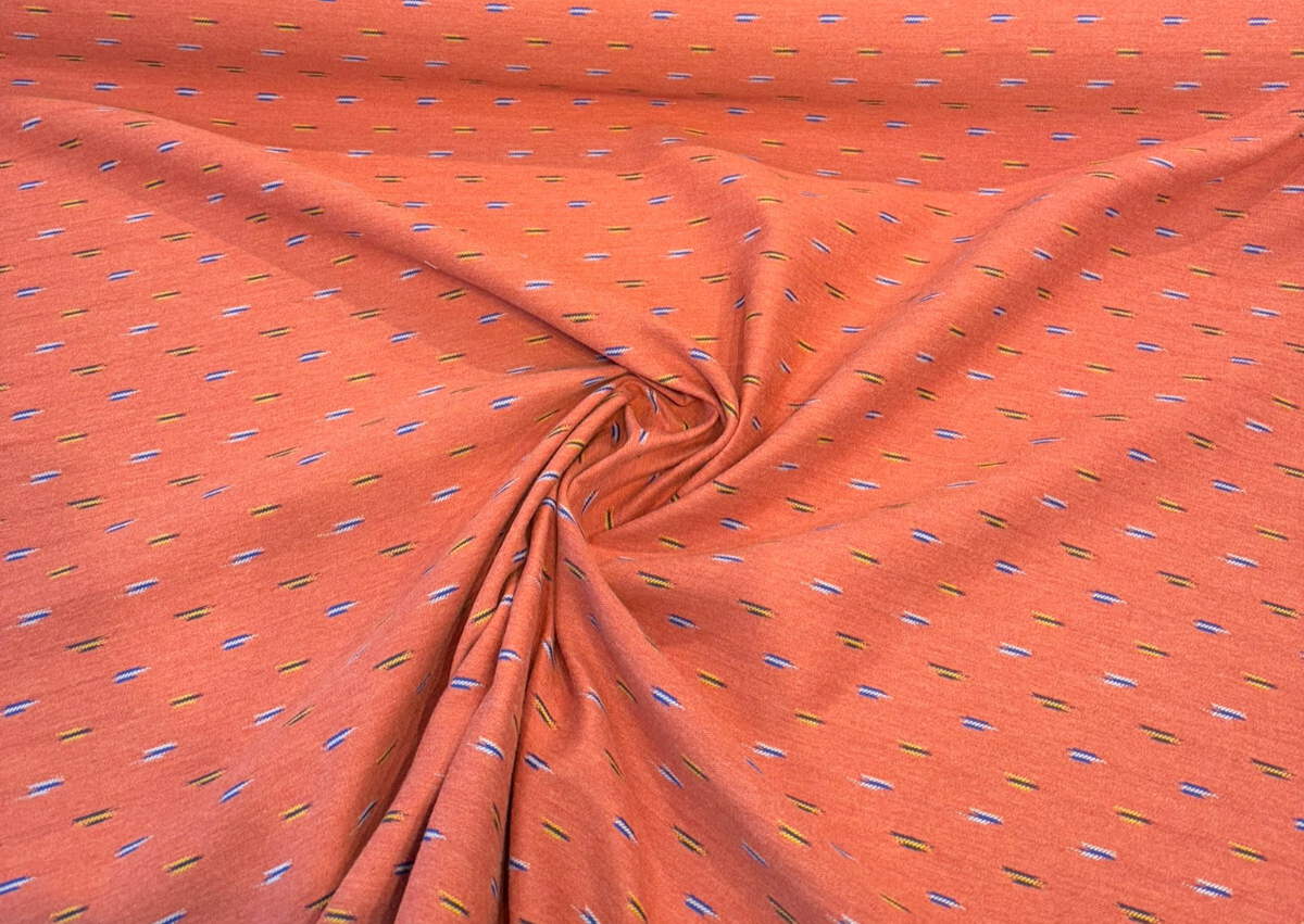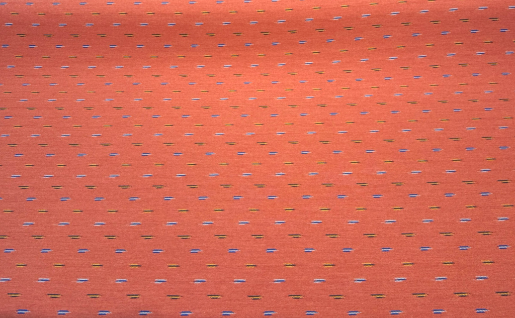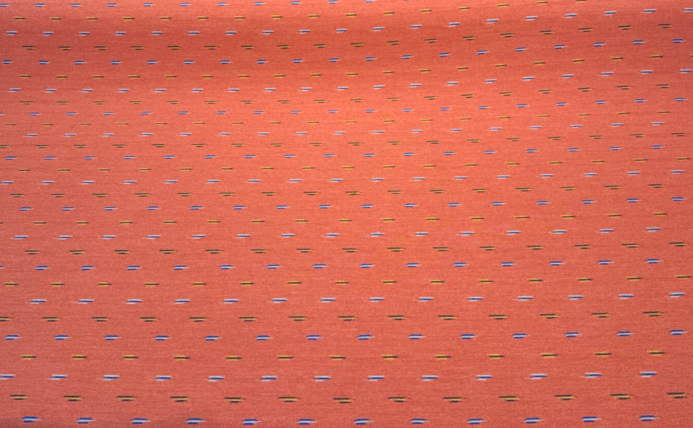 Bring bold, modern energy to your space with Sunbrella Bahasa Mesa (146026-0003), a richly woven upholstery fabric featuring a burnt rust background dotted with short multicolor dash patterns in blue, yellow, and black. This eye-catching fabric adds a playful yet sophisticated touch to any indoor or outdoor setting.