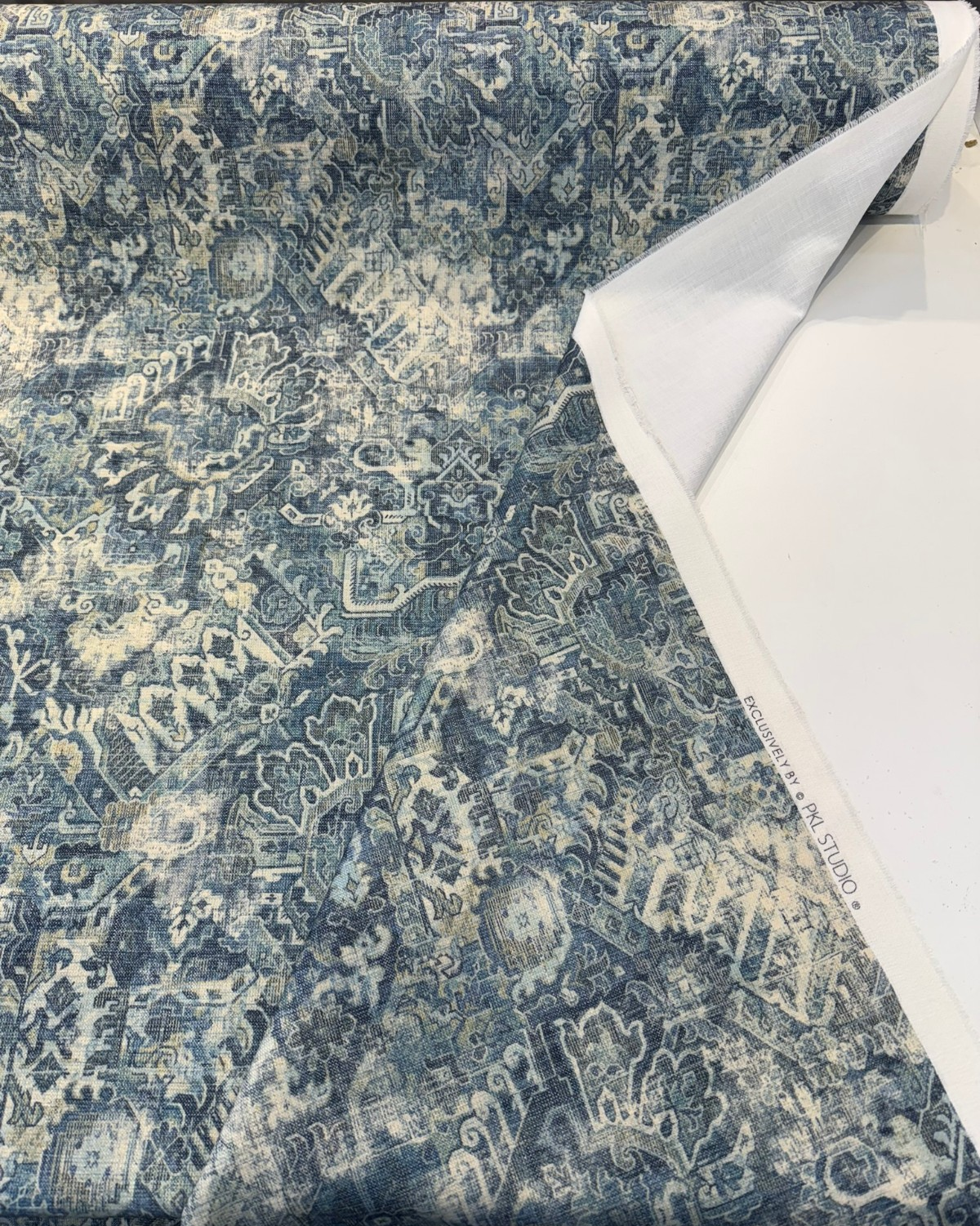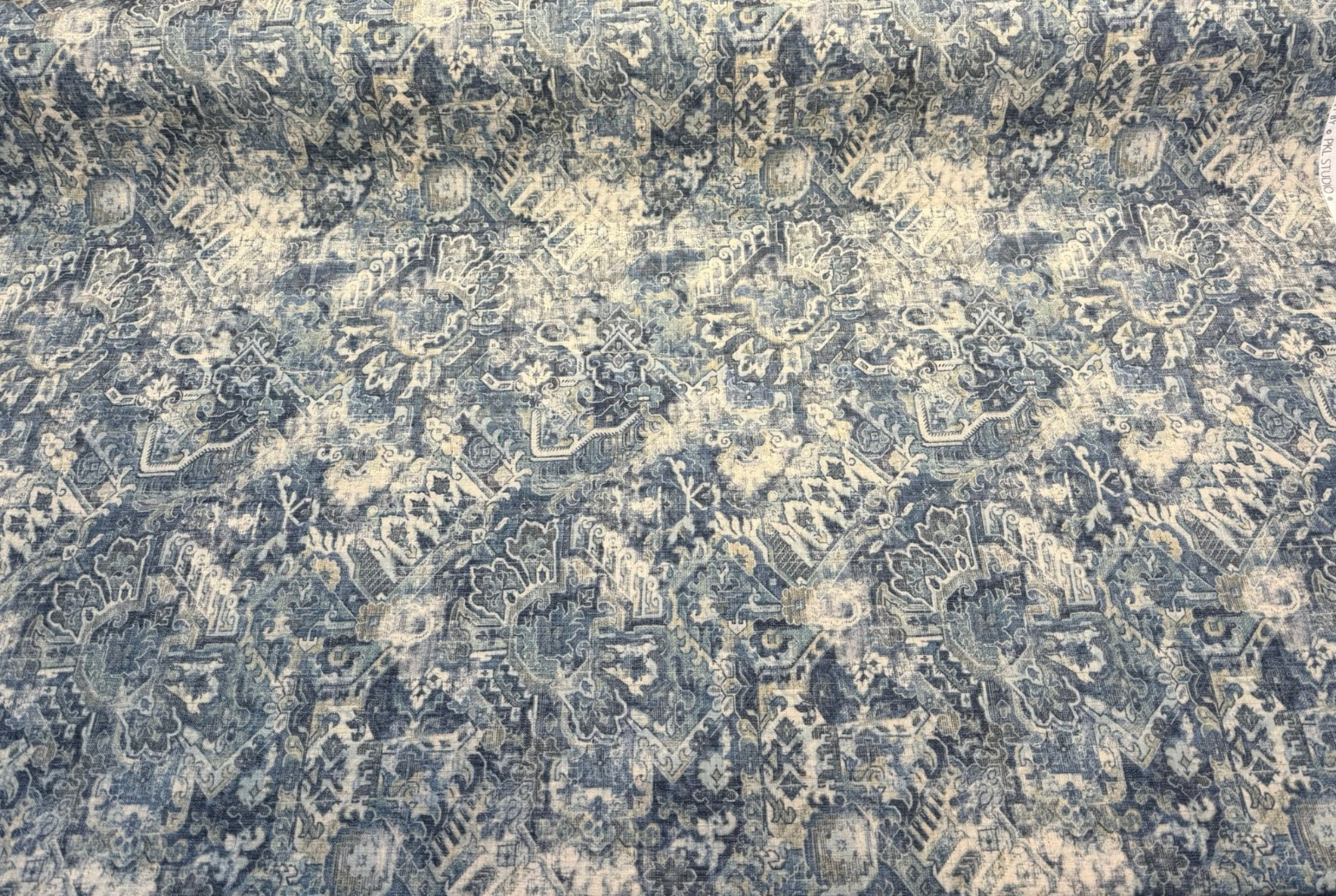 Bring rich texture and timeless artistry into your space with P/K Lifestyles Cumbrae Denim, a beautifully printed chenille fabric that blends global design influence with relaxed sophistication. Featuring a distressed medallion and abstract floral motif in layered shades of denim blue, ivory, and gray, this fabric evokes the look of handwoven textiles with a soft vintage character.