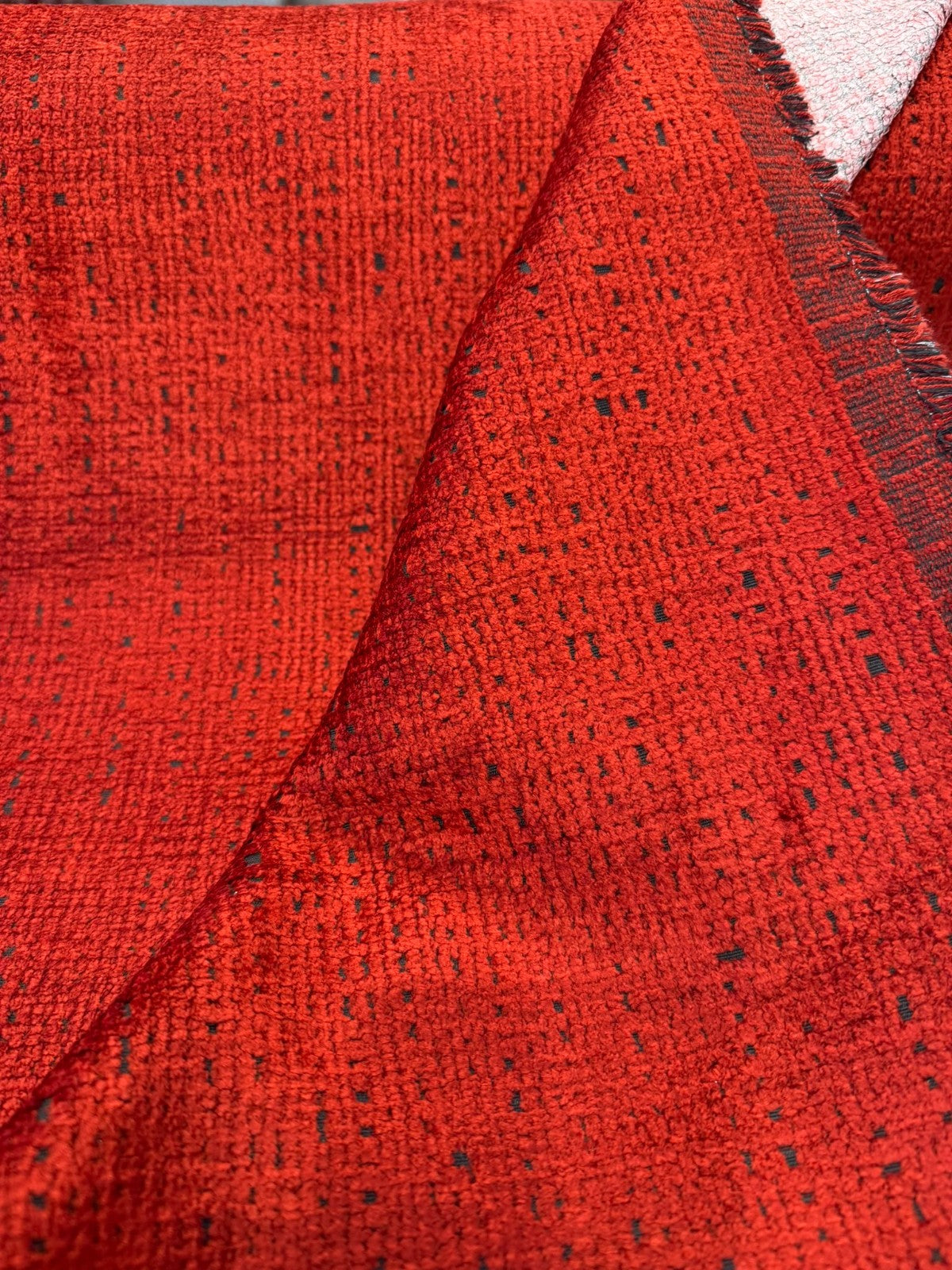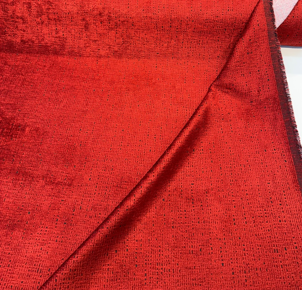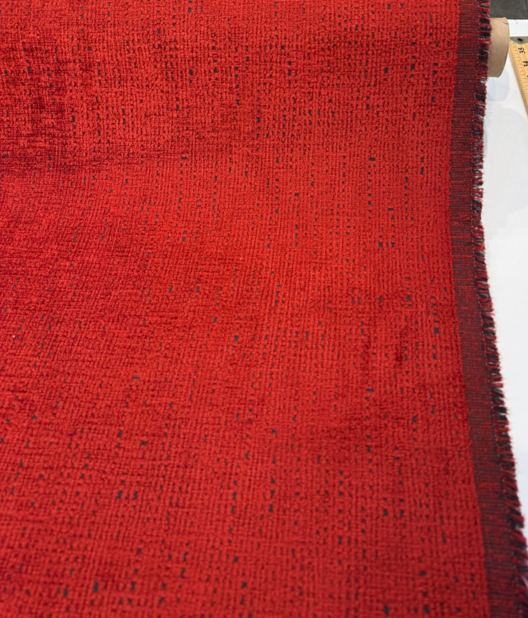 Fort Morgan in Crimson Red by P/Kaufmann is a bold, richly textured chenille upholstery fabric that adds warmth and sophistication to any interior. The deep crimson red tone is accented with subtle darker fibers woven throughout the pattern, creating dimension and visual interest while maintaining a classic designer look.
