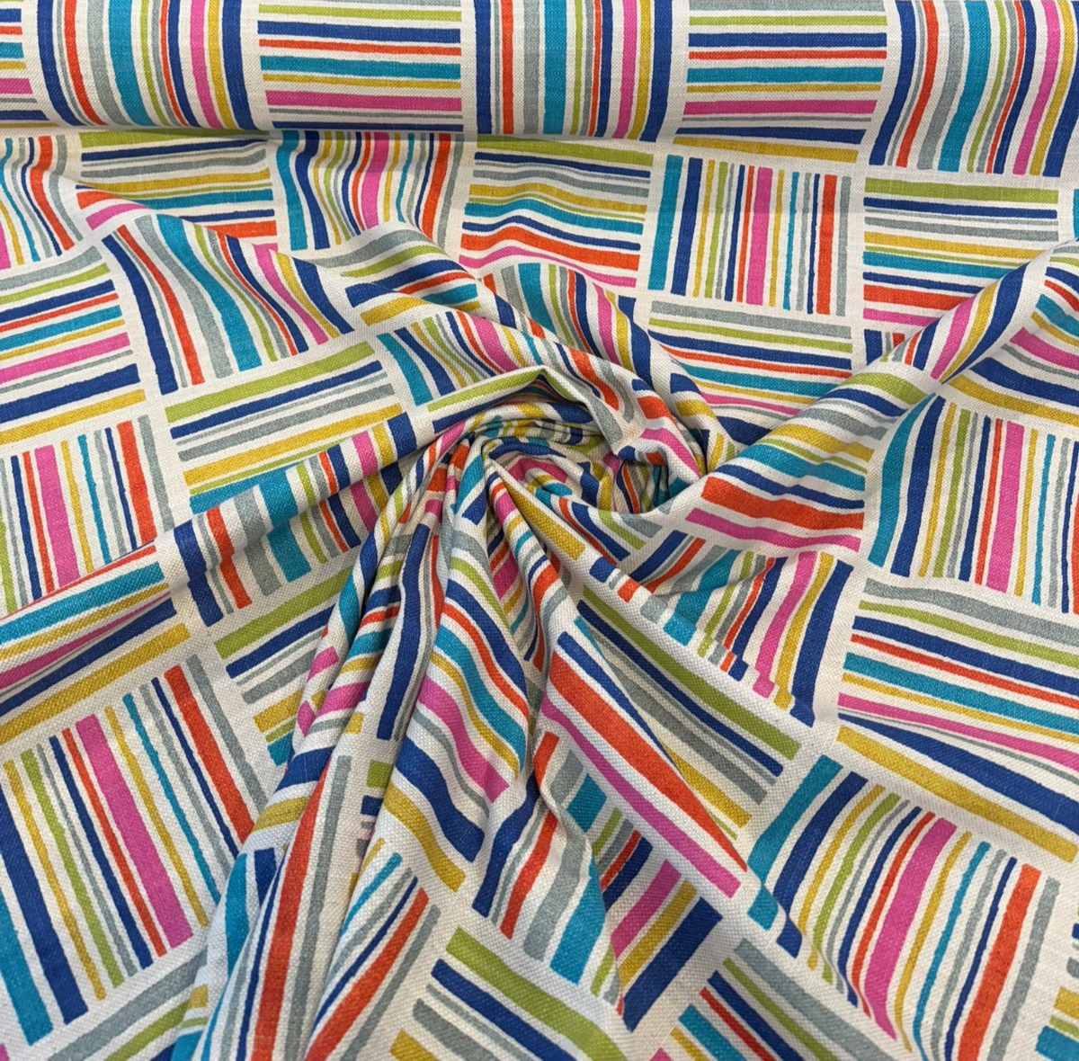 Bring modern flair to your home décor with PK Lifestyles Modern Matters Mosaic Drapery Upholstery Fabric by the Yard. This bold geometric fabric features a playful mosaic of multi-colored stripes in vibrant shades of blue, green, red, pink, and gold on a neutral background. Crafted from a durable blend of 75% cotton and 25% linen, this fabric combines softness with strength, making it ideal for both drapery and upholstery projects. With a substantial Wyzenbeek abrasion rating of 51,000 double rubs, it is designed to stand up to everyday use while maintaining its stylish appearance. Perfect for curtains, headboards, accent chairs, cornices, pillows, and more, this fabric’s modern block stripe design adds a fresh, contemporary statement to any interior.