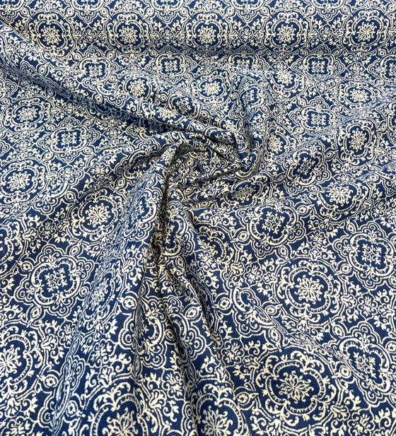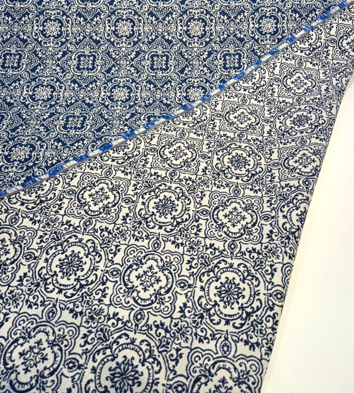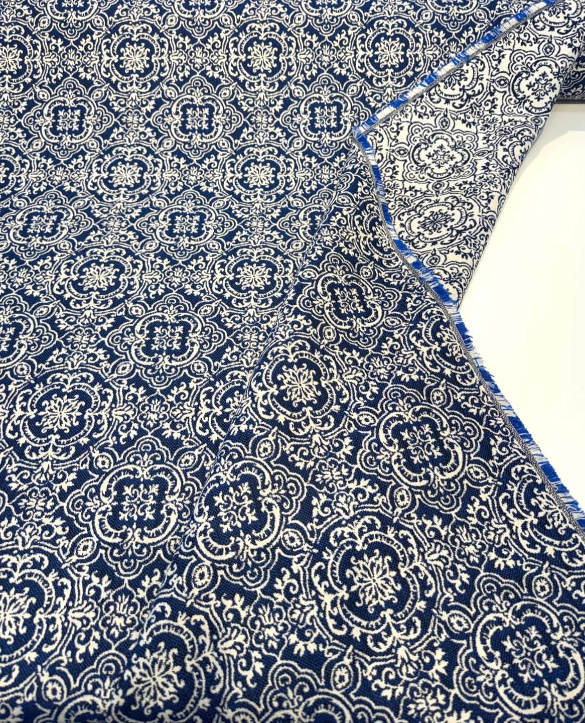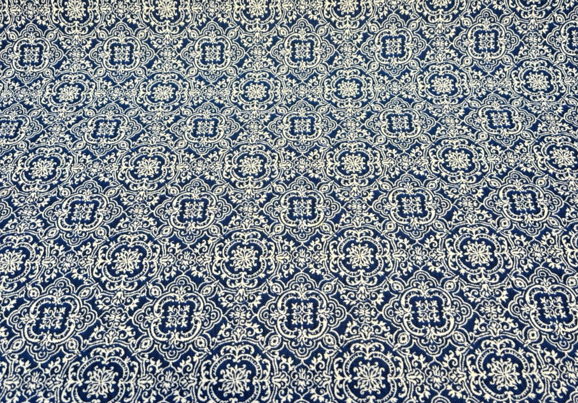 Elevate your outdoor or indoor décor with the timeless elegance of Sunbrella Amalfi Azure, a rich damask fabric in a stunning deep azure blue and ivory palette. Featuring a classic medallion motif with a repeat of 7.5" x 7.5", this fabric delivers both traditional charm and modern Sunbrella durability.