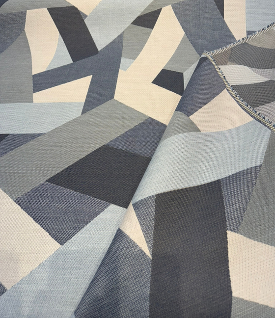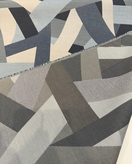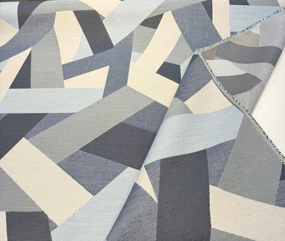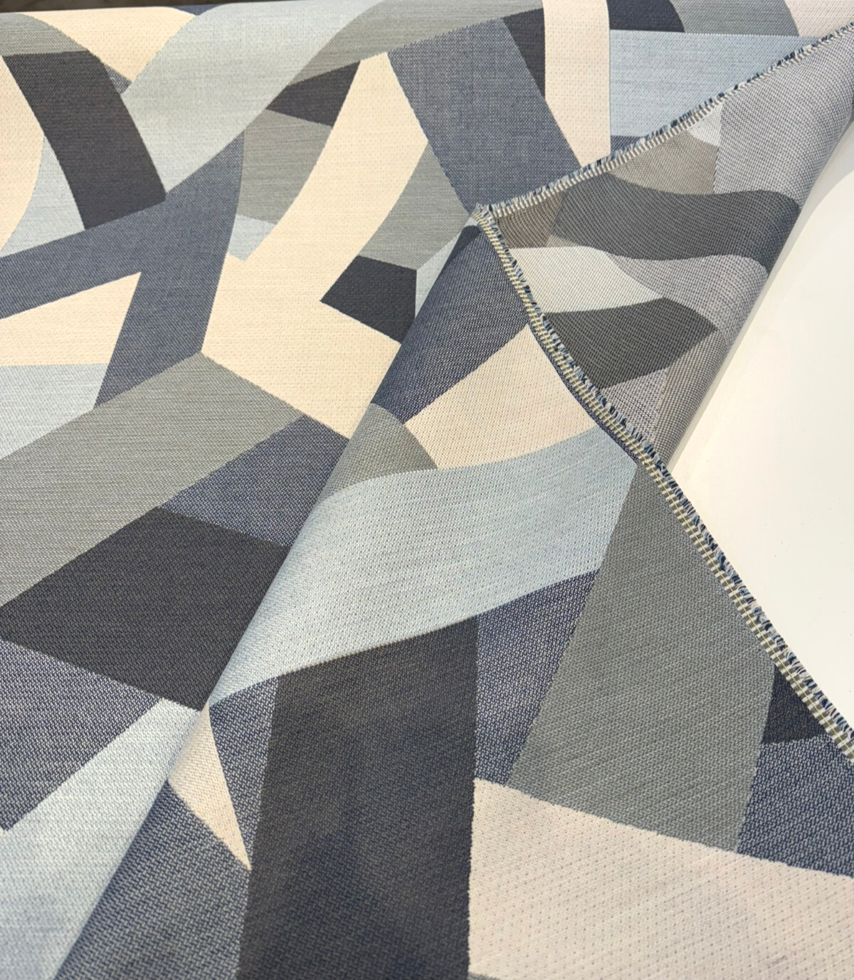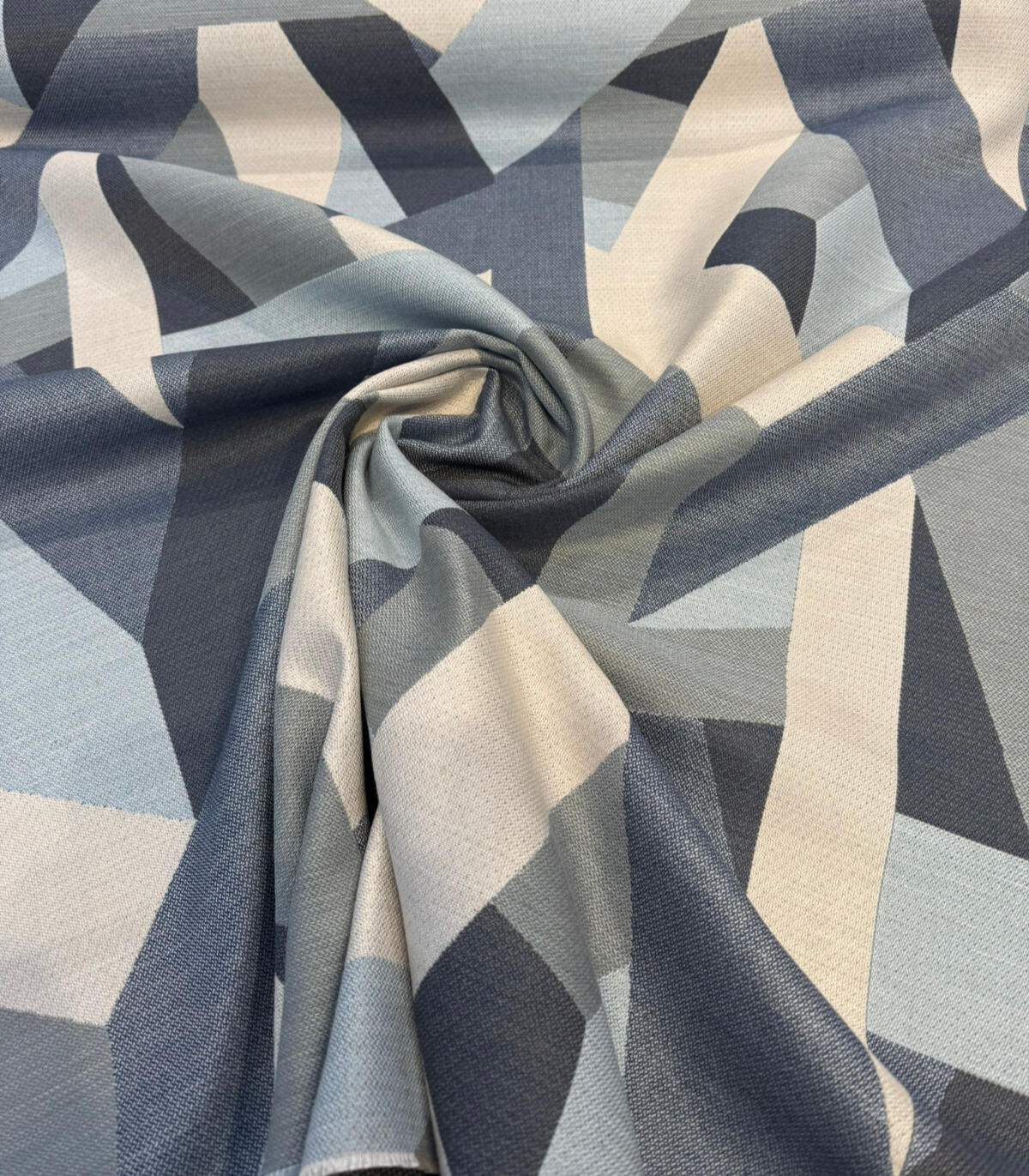Make a bold statement with Sunbrella Axis in Denim, a striking geometric performance fabric that layers deep navy, denim blue, slate, and ivory in an abstract, angular design. With a large-scale repeat and sharp architectural lines, Axis Denim brings dynamic movement and a modern edge to any space.