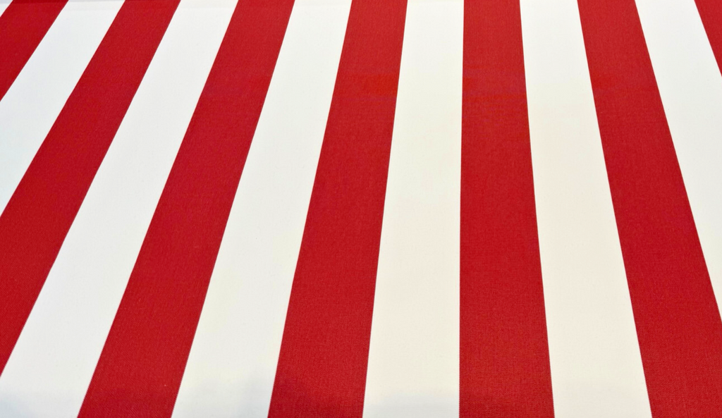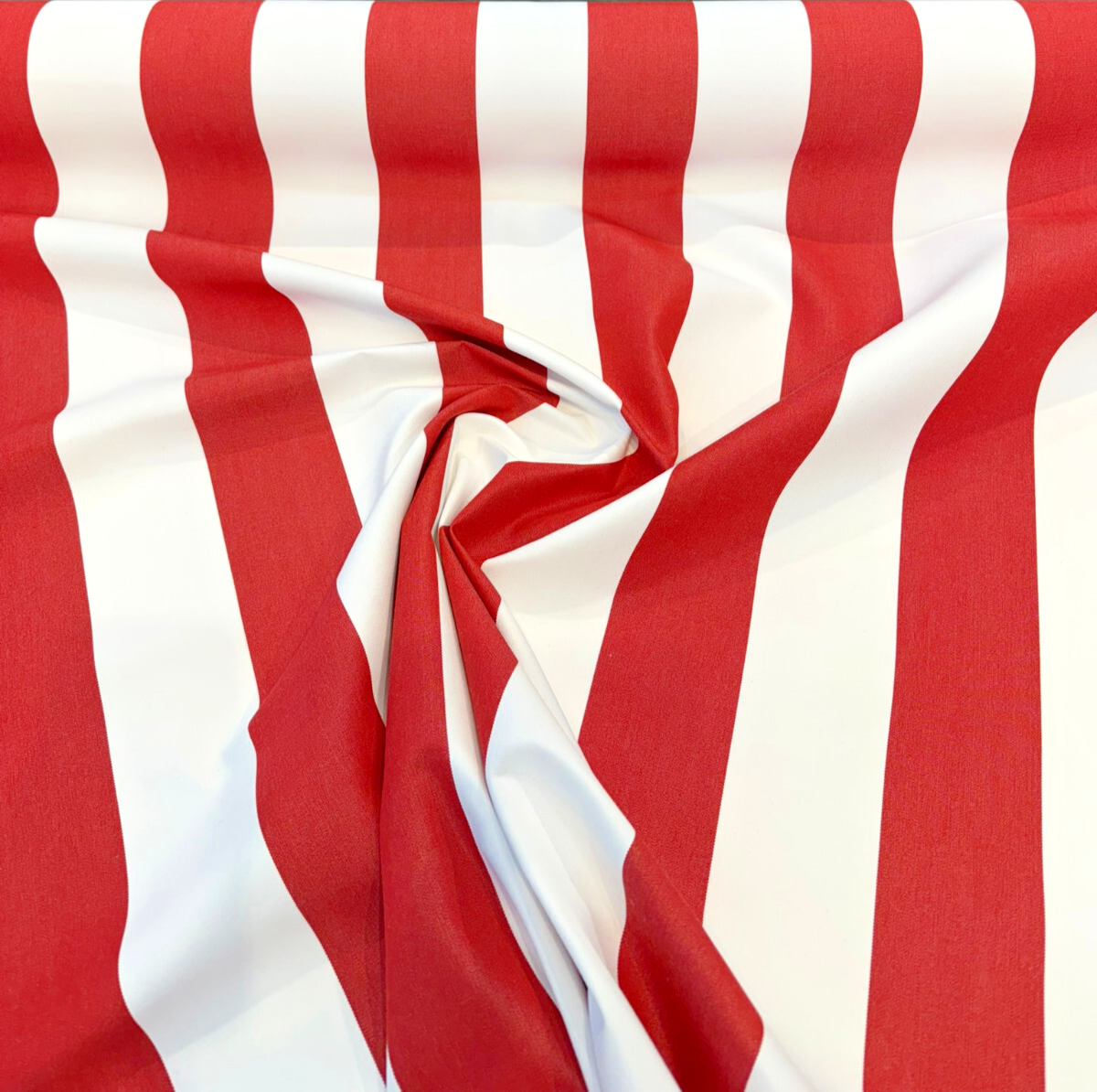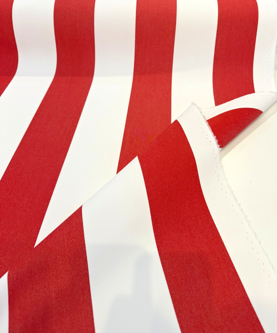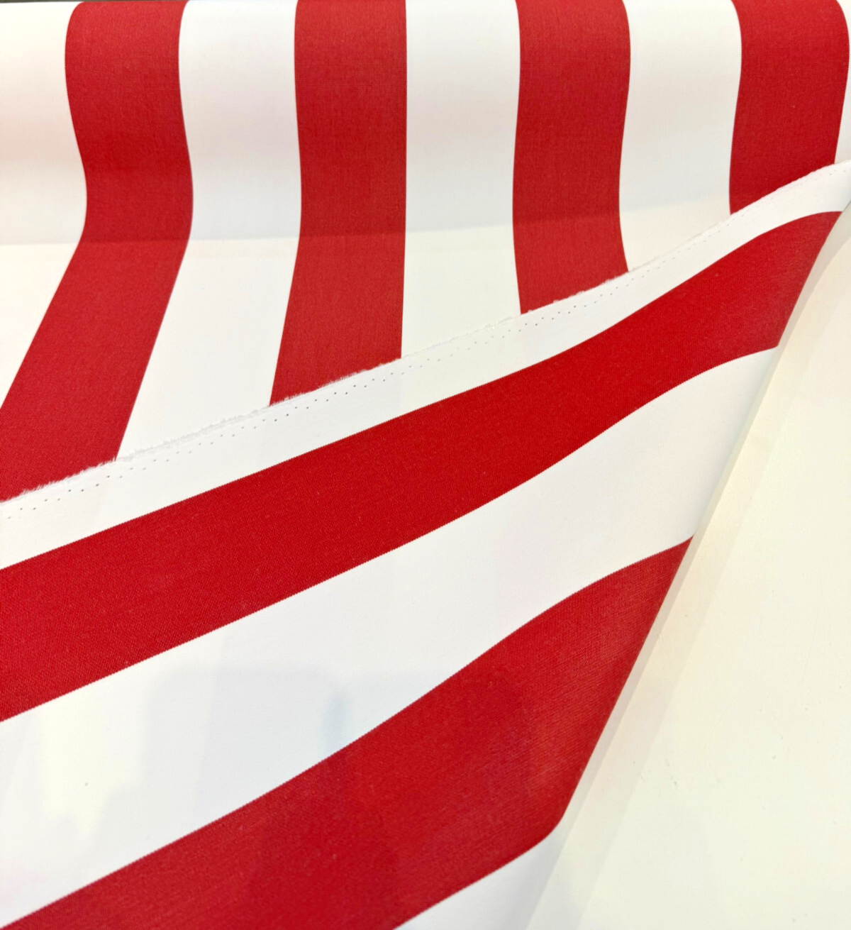 Sunbrella Cabana Crimson is a vibrant take on a timeless cabana stripe, featuring bold crimson red and crisp white vertical bands. This performance fabric is ideal for adding a cheerful yet classic look to both indoor and outdoor spaces. Made from 100% Sunbrella acrylic, it offers exceptional durability, fade resistance, and easy care—perfect for upholstery, cushions, pillows, awnings, and curtains. Whether used poolside, on a patio, or in a kitchen nook, Cabana Crimson holds its color and charm through seasons of sun and use.