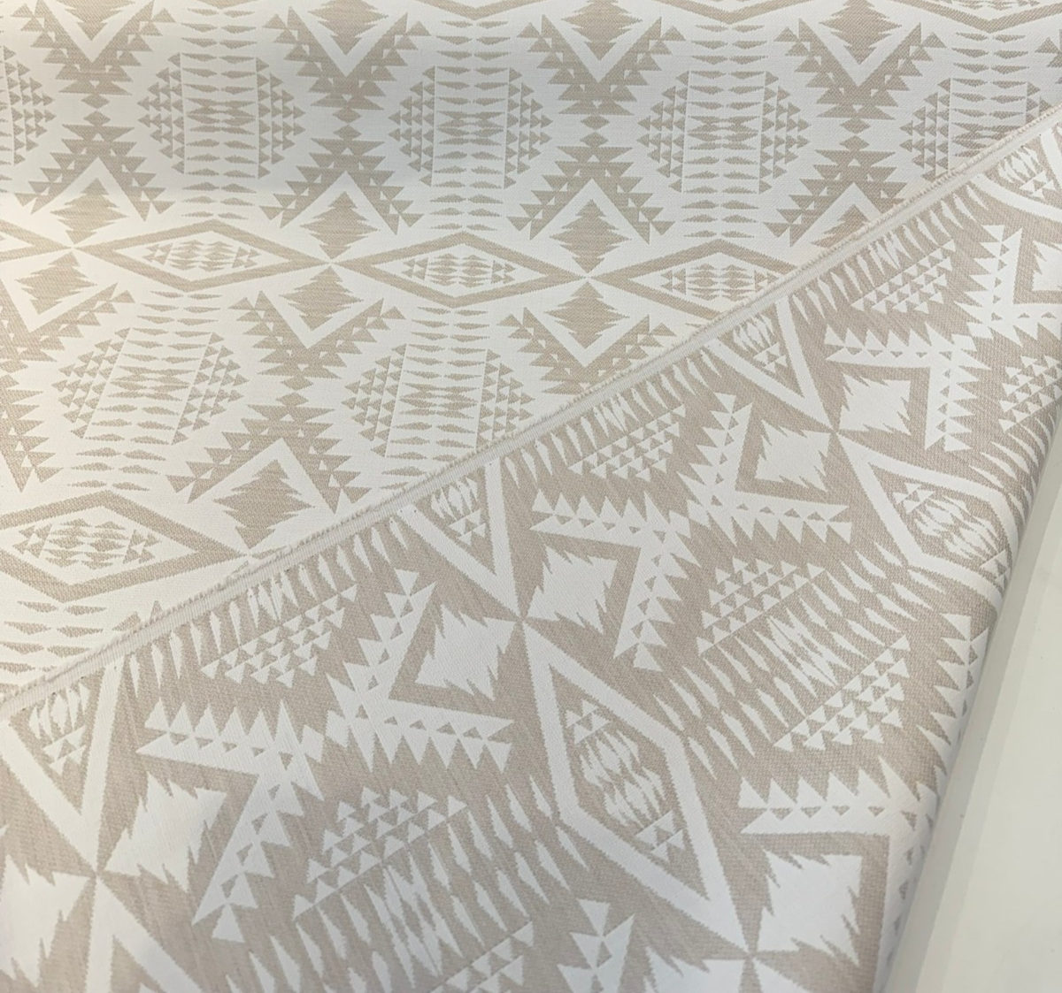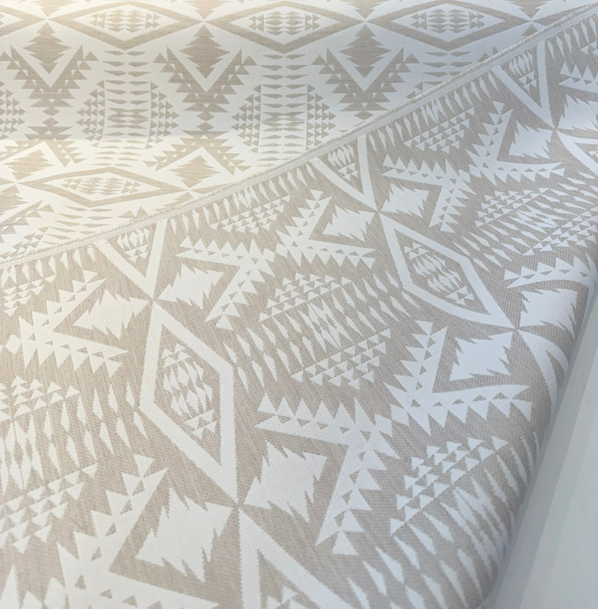 Create a serene and timeless look with Sunbrella Diamond River Tonal Snow, an exclusive Pendleton® x Sunbrella® collaboration. This elegant indoor/outdoor fabric features a large-scale geometric lodge pattern in soft snow white and warm beige tones, offering a refined and versatile aesthetic inspired by classic Pendleton designs.