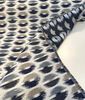 Sunbrella Escape Sapphire is a high-performance indoor/outdoor fabric featuring an abstract ikat design in deep navy, sapphire blue, steel gray, and ivory. The oval motif evokes the shimmer of reflected water, making it a stylish option for coastal, contemporary, or transitional spaces. Crafted from 100% solution-dyed acrylic, this fabric resists fading, mold, mildew, stains, and water—while maintaining a soft hand suitable for indoor use as well.