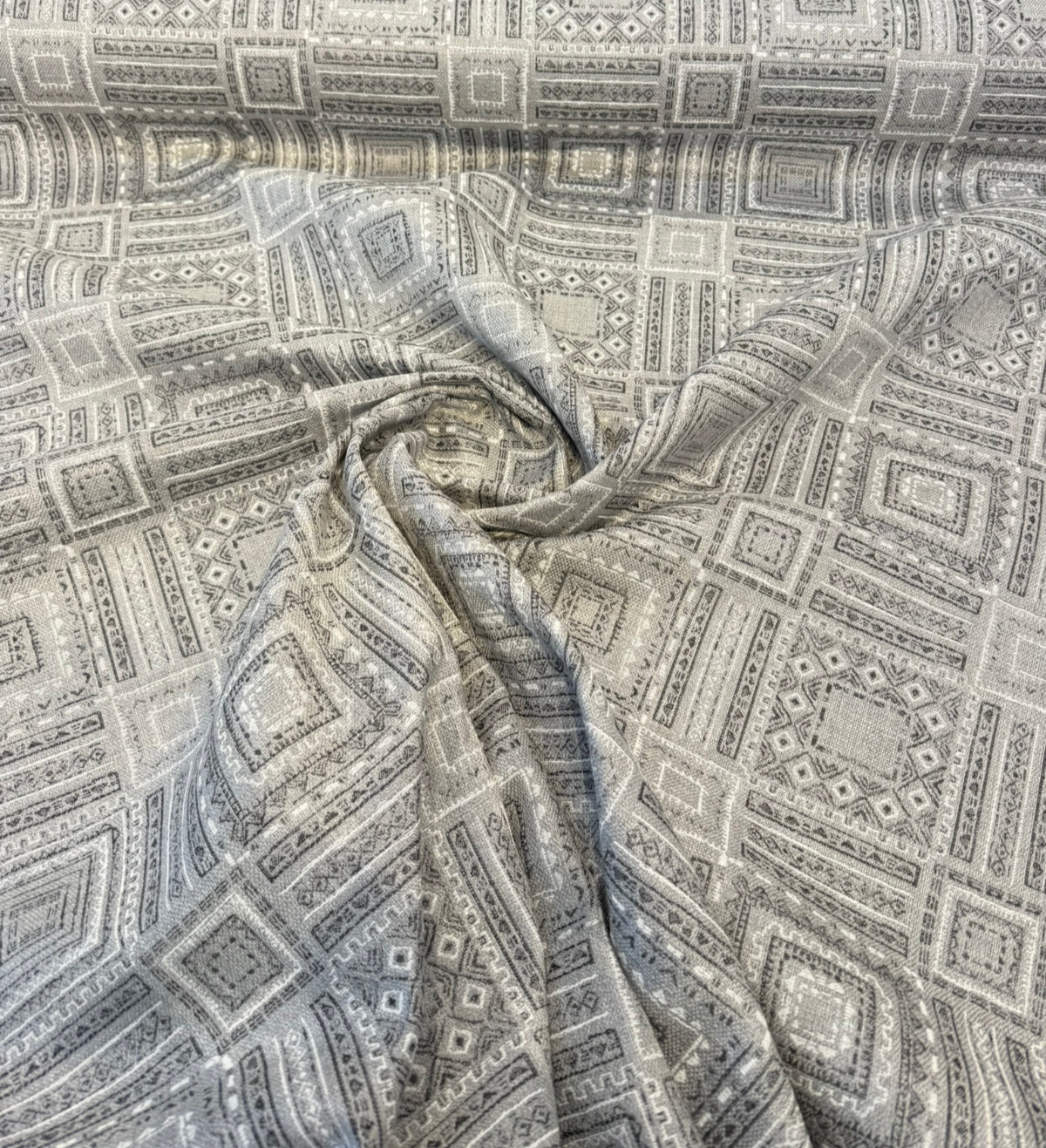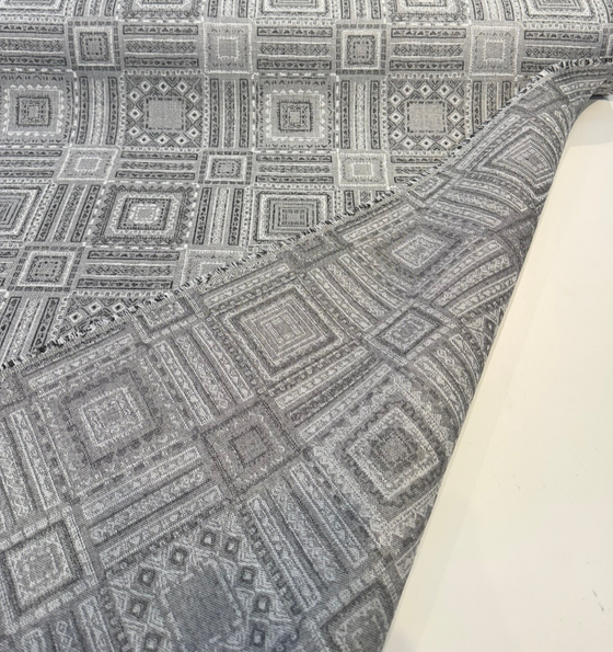 Make a bold statement with Sunbrella Garza Gray Fog, a high-performance upholstery fabric showcasing a detailed geometric square pattern in tones of gray and black. With its tribal-inspired motif and symmetrical design, this fabric adds visual texture and sophistication to any space—indoors or out.