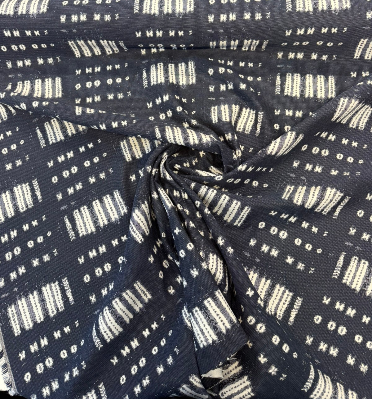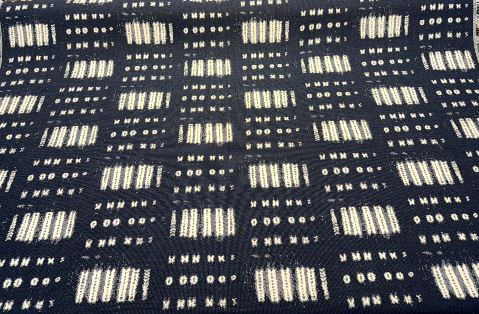The pattern includes artistic, block-style motifs with a slightly distressed look, giving it a modern, artisan feel.