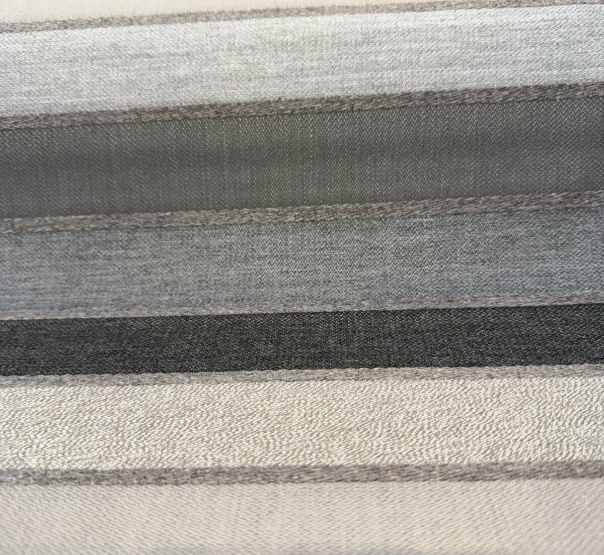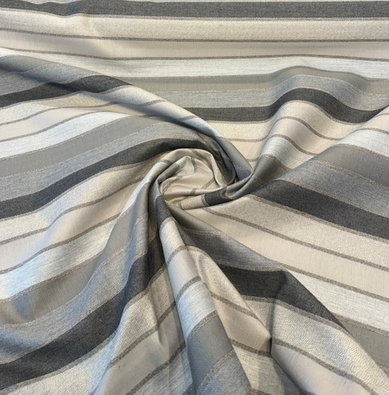 Sunbrella Lucy Asphalt is a sophisticated stripe performance fabric featuring a rich palette of taupe, pebble, gray, and charcoal with textured raised borders for added depth. Designed in collaboration with Ballard Designs, this fabric is part of the premium Sunbrella Performance collection. Crafted in the USA with 100% solution-dyed acrylic, it offers a soft hand and remarkable durability, making it ideal for both indoor and outdoor use. The 10 3/8" horizontal repeat and railroaded layout make it perfect for wide applications like cushions, benches, and drapery. Resistant to UV rays, fading, mold, and stains—and bleach-cleanable—it’s a high-style solution for high-traffic areas.