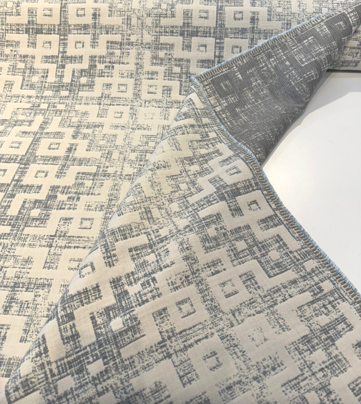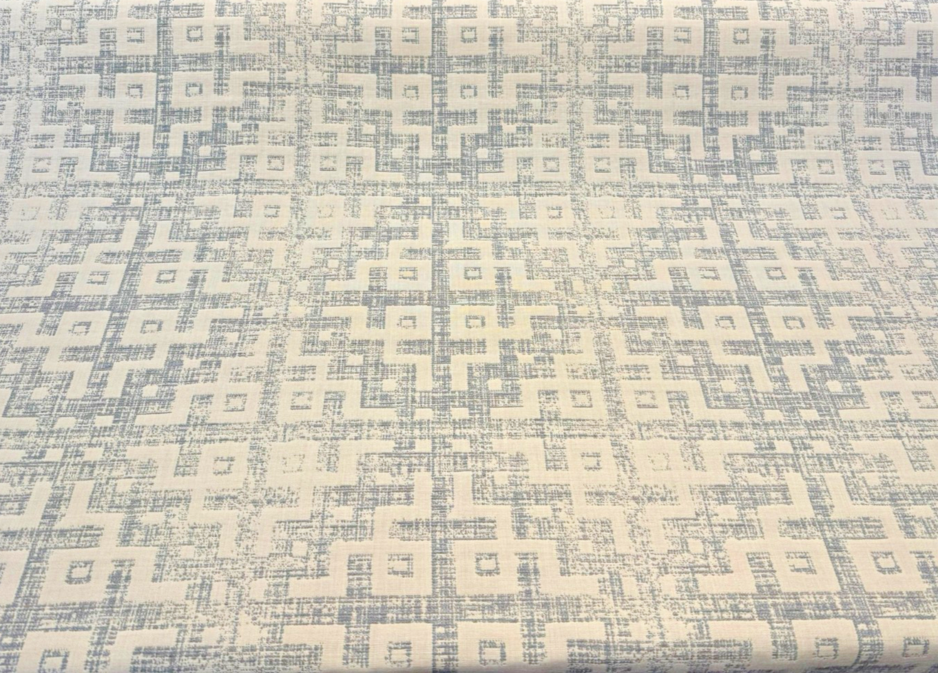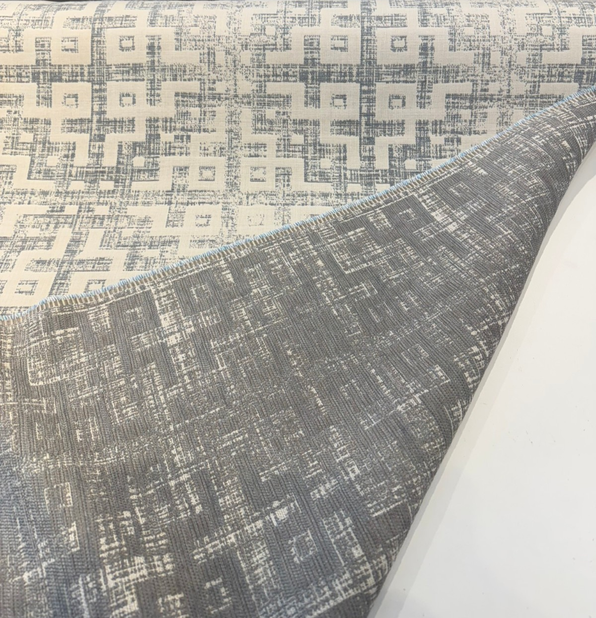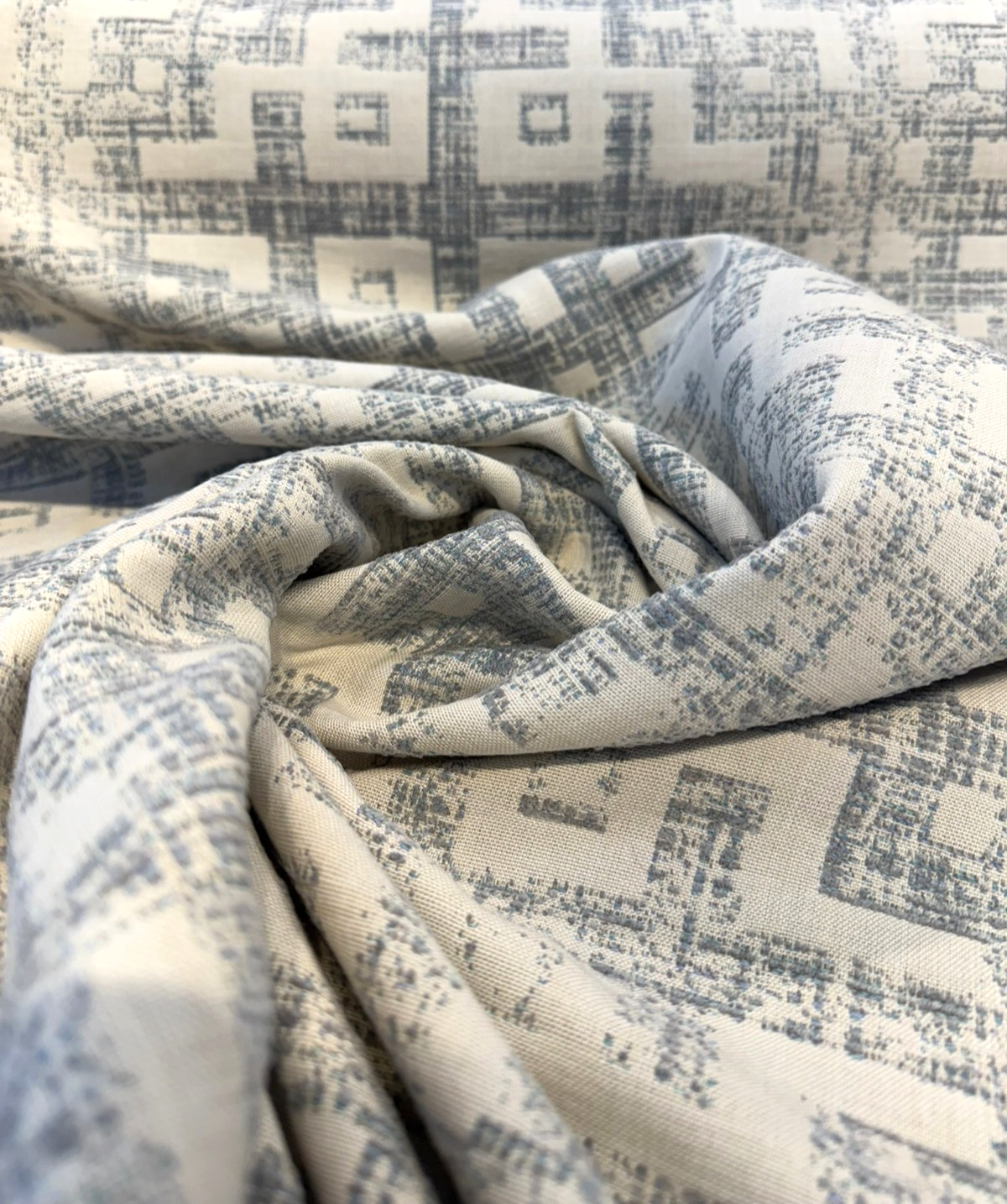 Refresh your space with the soft sophistication of Sunbrella Merchant Mist Blue, a high-performance outdoor fabric featuring a distressed geometric design in cool mist blue and ivory tones. This pattern offers a modern take on artisan-inspired motifs, making it a versatile option for both contemporary and transitional settings.