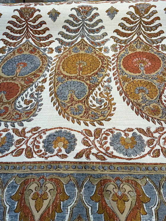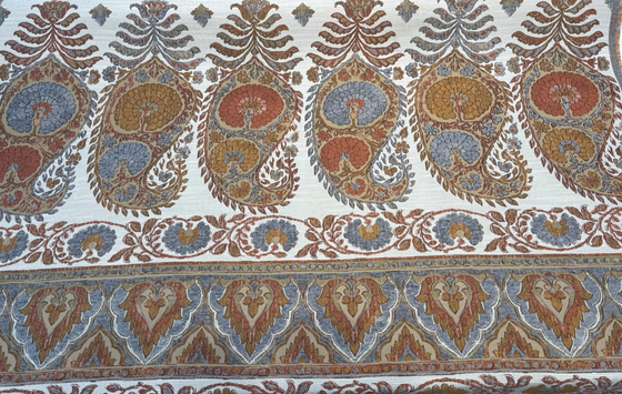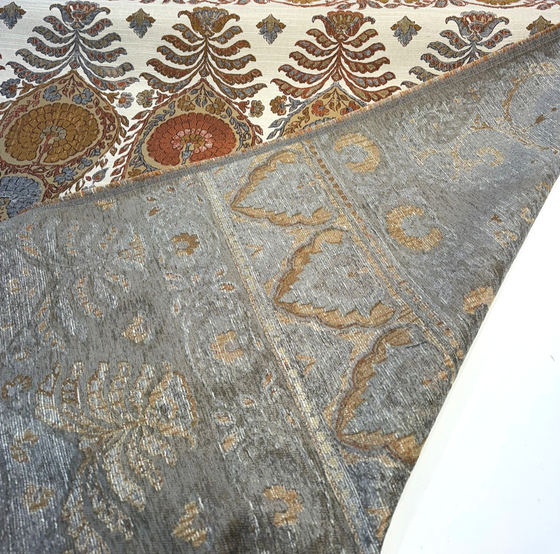 Swavelle Pear Up Russet is a richly woven chenille upholstery fabric that features an oversized paisley and floral damask motif with traditional decorative borders. The large-scale design makes a bold and elegant statement, ideal for feature upholstery like sofas, headboards, or statement armchairs. Ornamental pear-shaped medallions are detailed with intricate floral elements and surrounded by climbing vines and stylized leaves.
