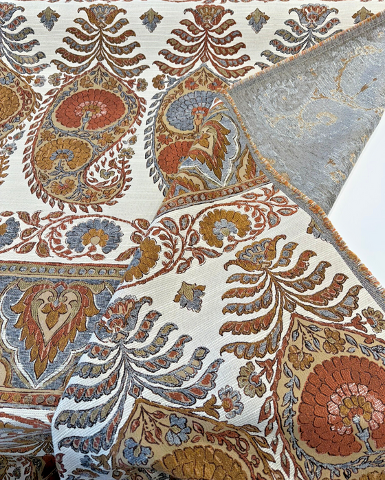 The color palette includes burnt orange (russet), ochre gold, dusty blue, taupe, ivory, and muted charcoal, layered over a creamy backdrop. A coordinating border stripe runs along one edge, adding flexibility for vertical or horizontal placement in upholstery projects. The chenille texture offers a soft, plush feel while maintaining structure and durability.