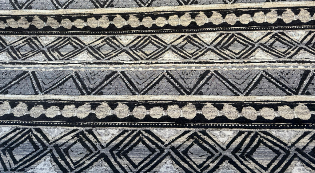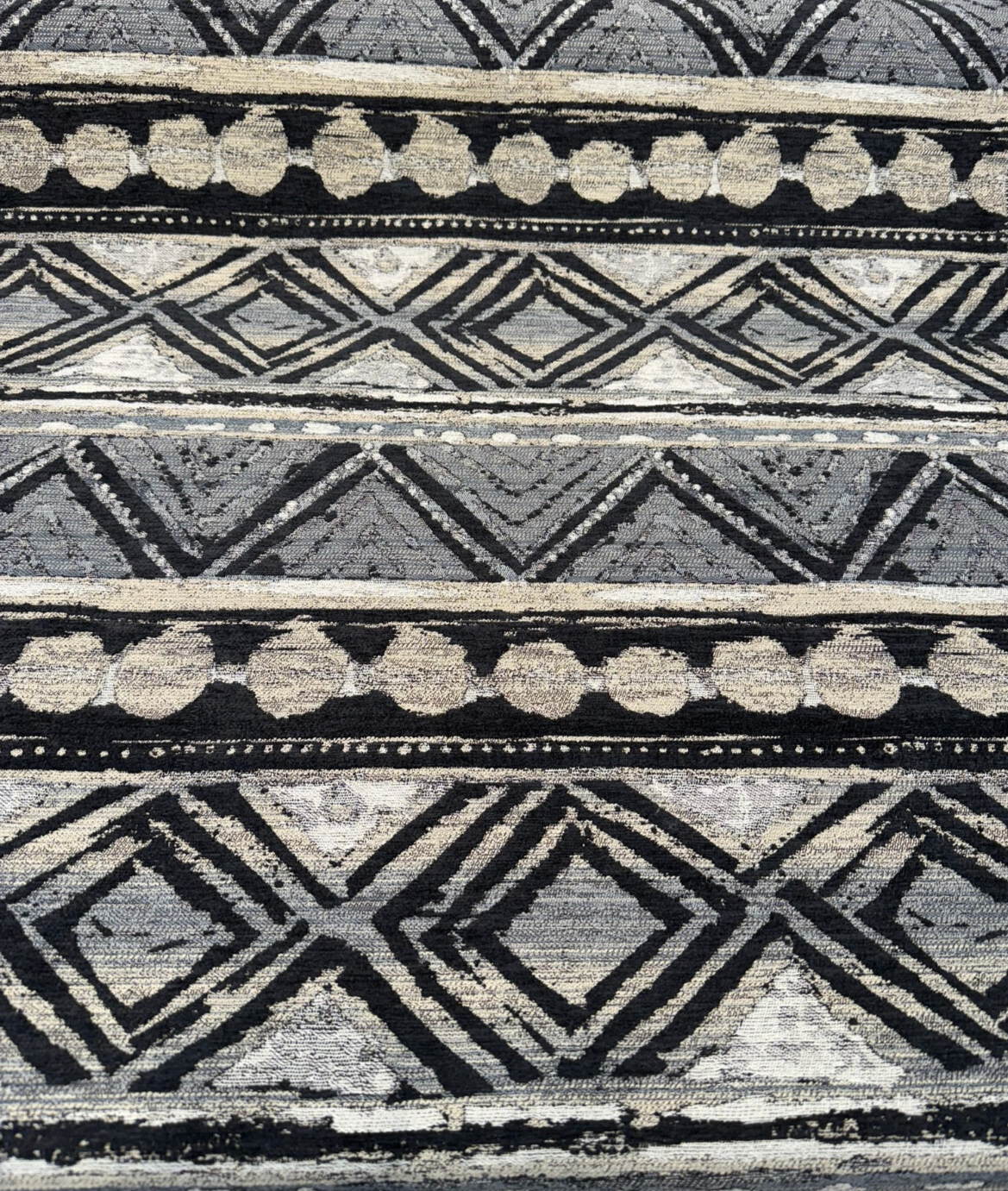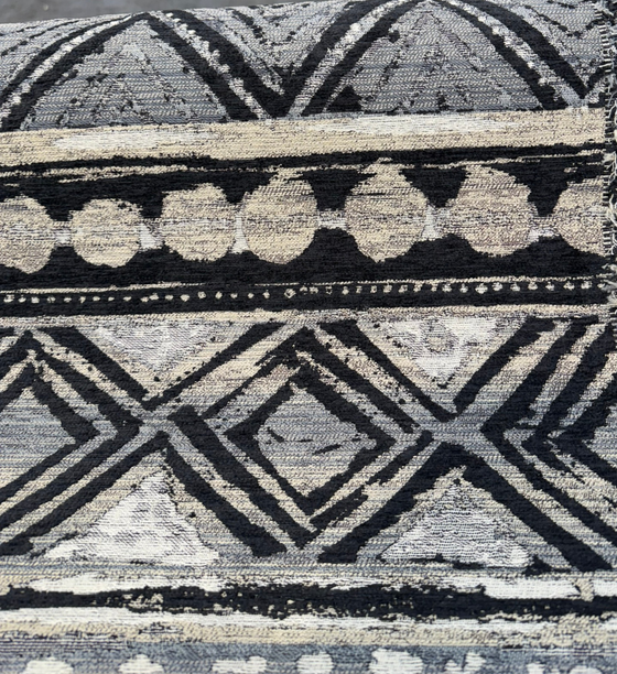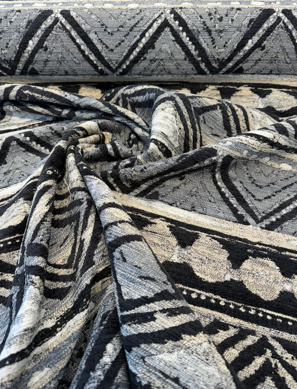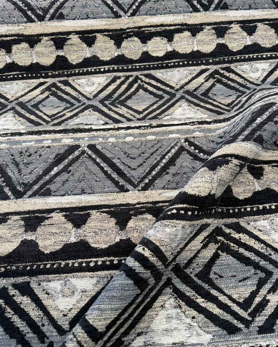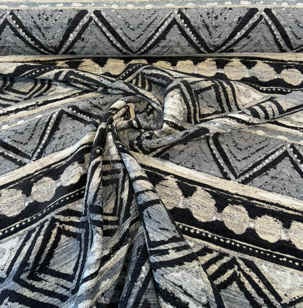 • Bring bold, contemporary energy to your interiors with Swavelle Tribal Nunatak Black Storm Chenille Upholstery Fabric. Featuring a dynamic tribal stripe in rich black, charcoal, and ivory tones, this textured chenille makes a powerful design statement. Its mix of geometric diamonds, chevrons, and dotted lines evokes a modern global aesthetic while maintaining a versatile neutral palette. Ideal for sofas, chairs, headboards, or accent pieces, this durable fabric adds depth and drama to any upholstery project.
