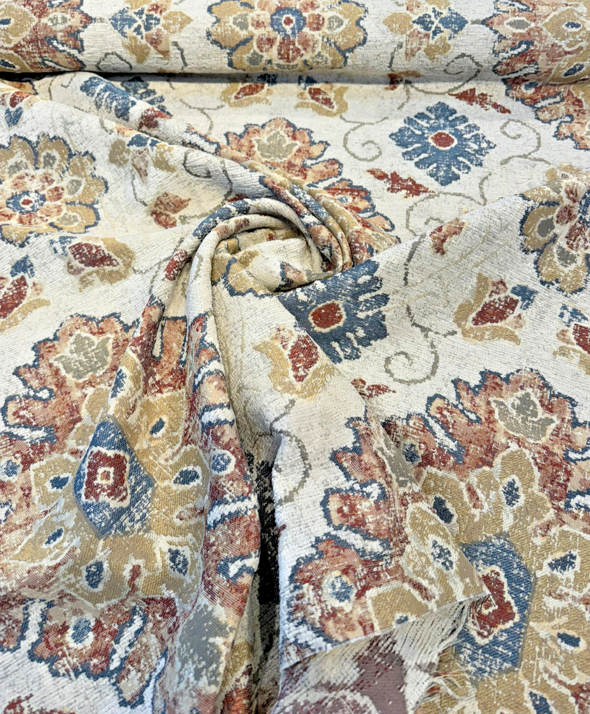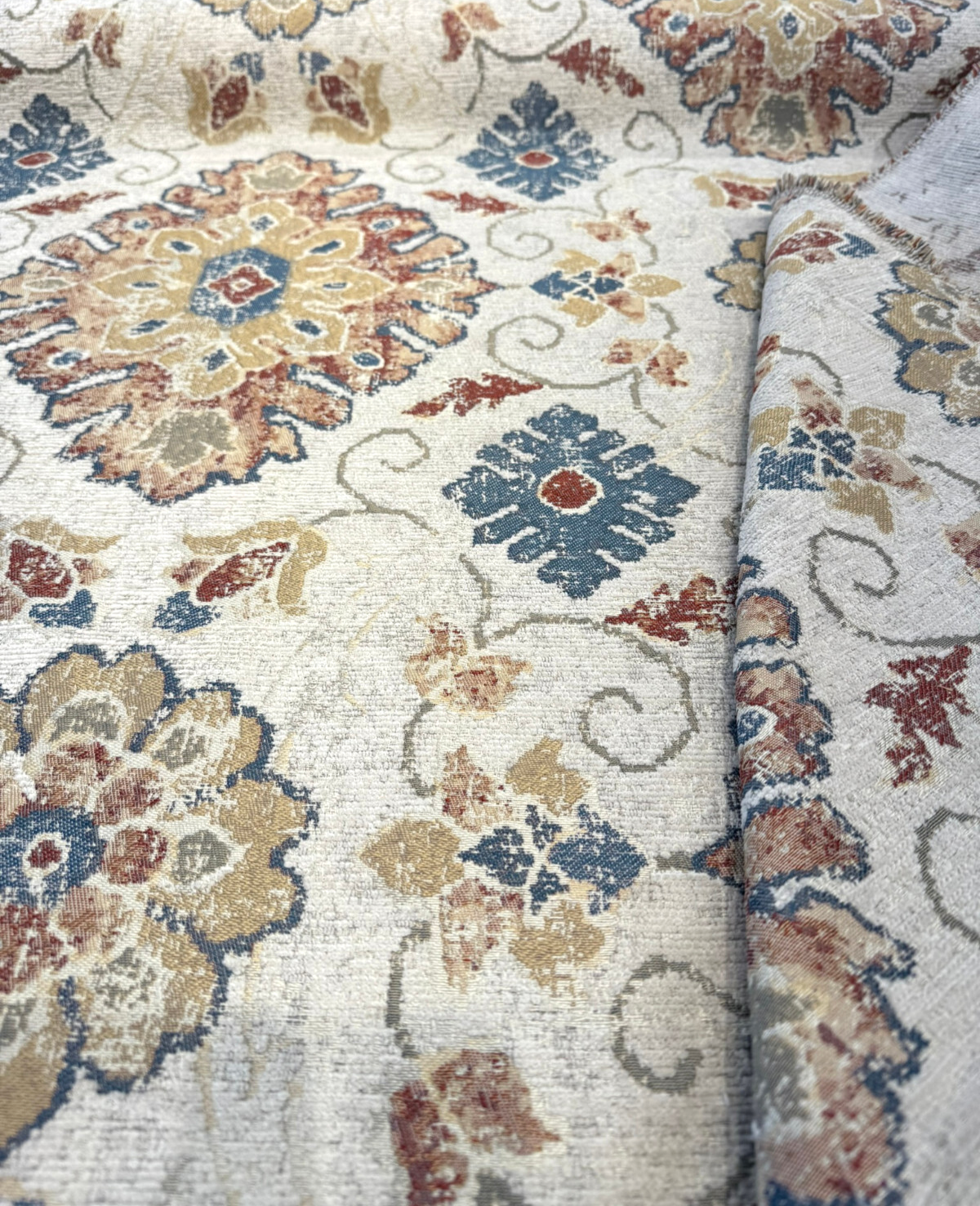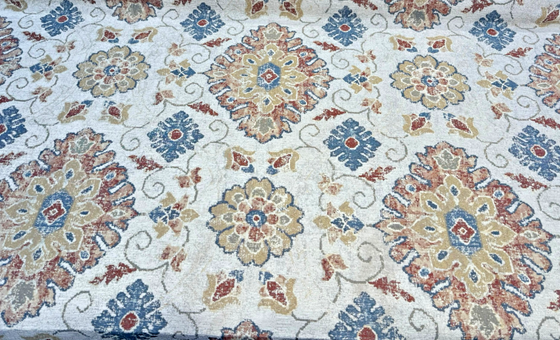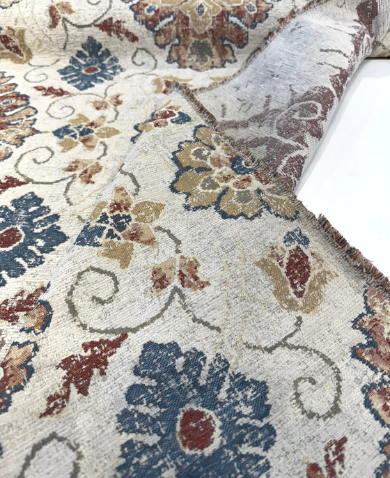 Add timeless elegance and rich texture to your home with Swavelle’s Uwharrie Liberty Medallion Chenille Upholstery Fabric. This fabric showcases a classic medallion motif in warm tones of rust, gold, slate blue, and ivory, woven on a soft chenille base. Ideal for both traditional and transitional spaces, it’s perfect for creating statement upholstery pieces with a cozy, vintage feel.