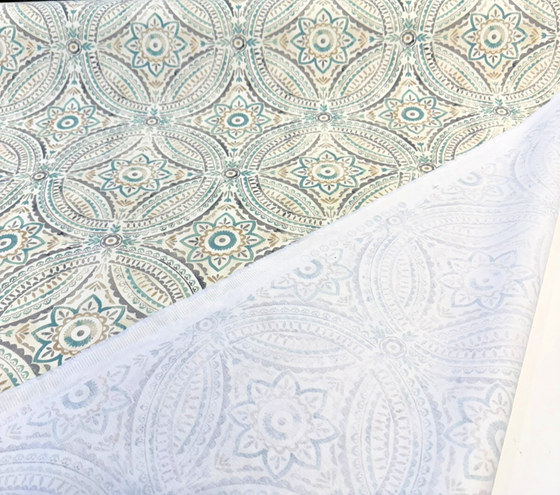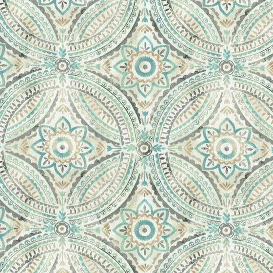 Add a calming, artistic touch to your décor with Waverly Blissfulness Spa from the Kelly Ripa Home Collection. This medallion-inspired fabric features soft aqua, spa blue, beige, and gray in a beautifully symmetrical, watercolor-style design. Made in the USA from 100% cotton with a Waybond finish, this fabric is ideal for light-duty upholstery, drapery, pillows, and decorative accents. Its 9" x 9" repeat gives it a balanced and modern geometric flow.