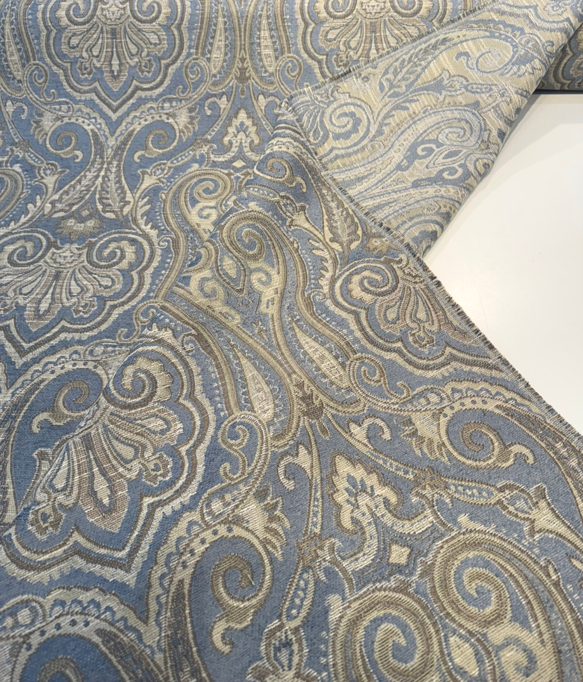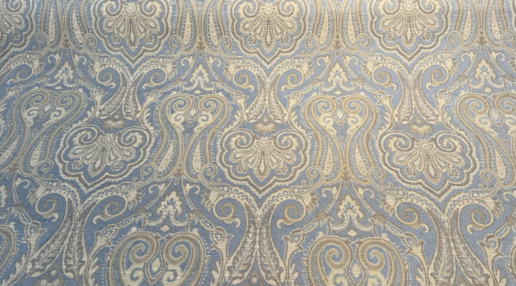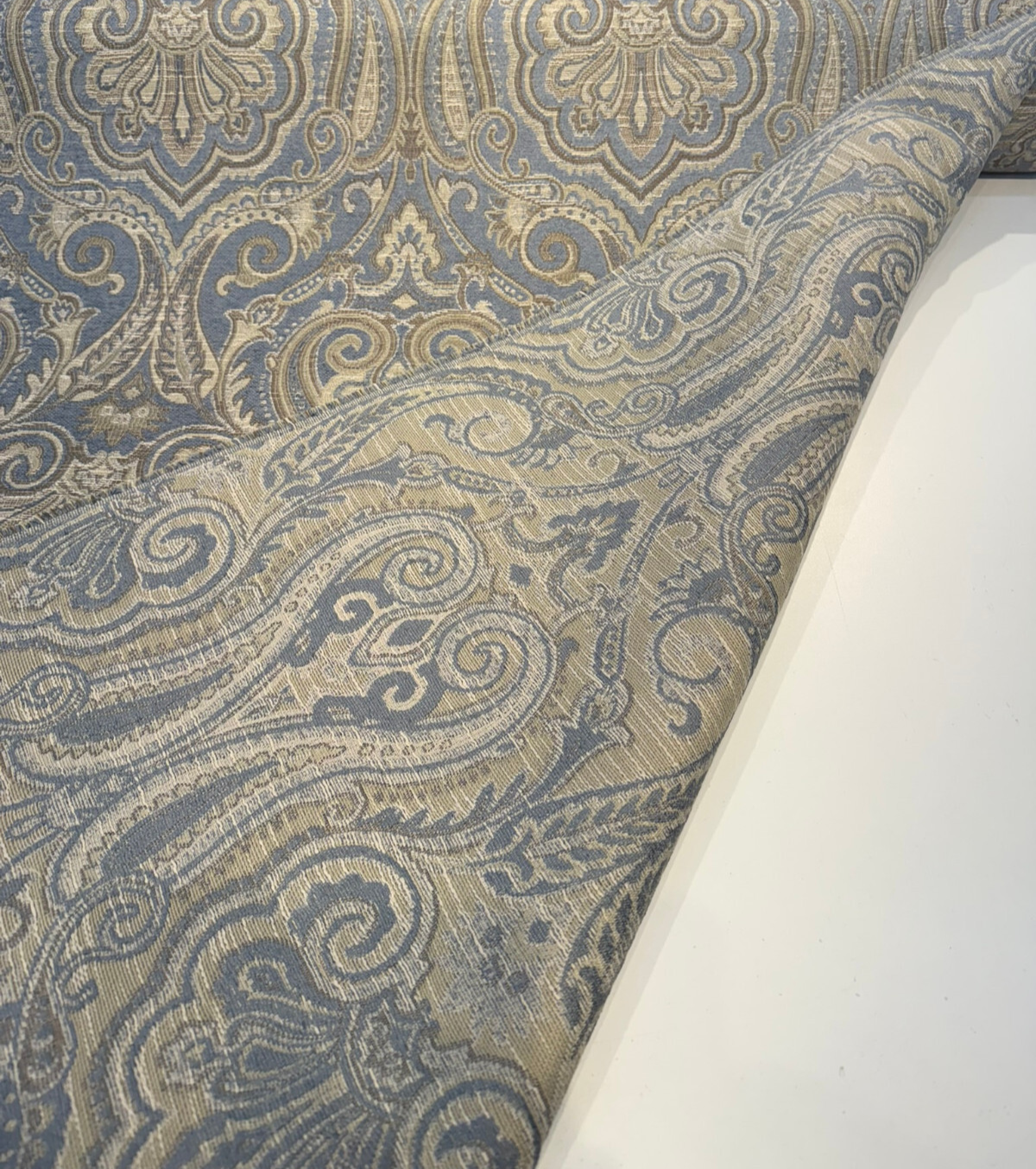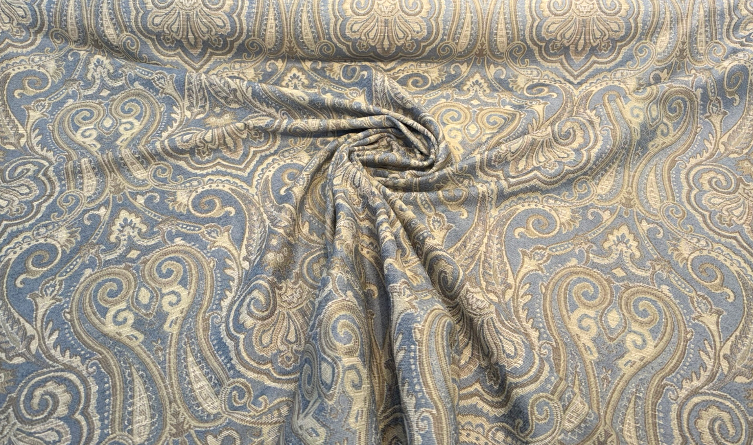 Waverly Clubroom Paisley Damask Lagoon Chenille Upholstery Fabric by the Yard features an ornate damask motif woven into a textured chenille ground. The design showcases scrolling paisley elements and classical floral medallions in a rich lagoon blue backdrop with accents of taupe, ivory, beige, and muted gold. The elegant interplay of cool and warm tones adds depth and timeless style to this sophisticated upholstery fabric.