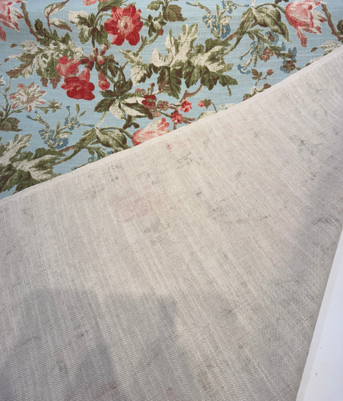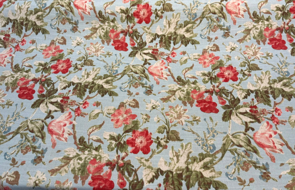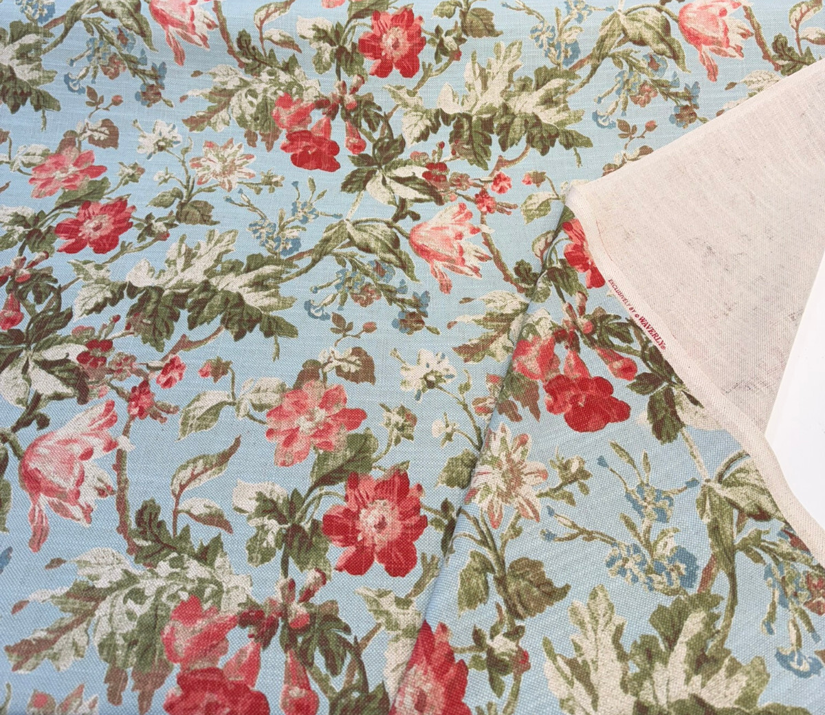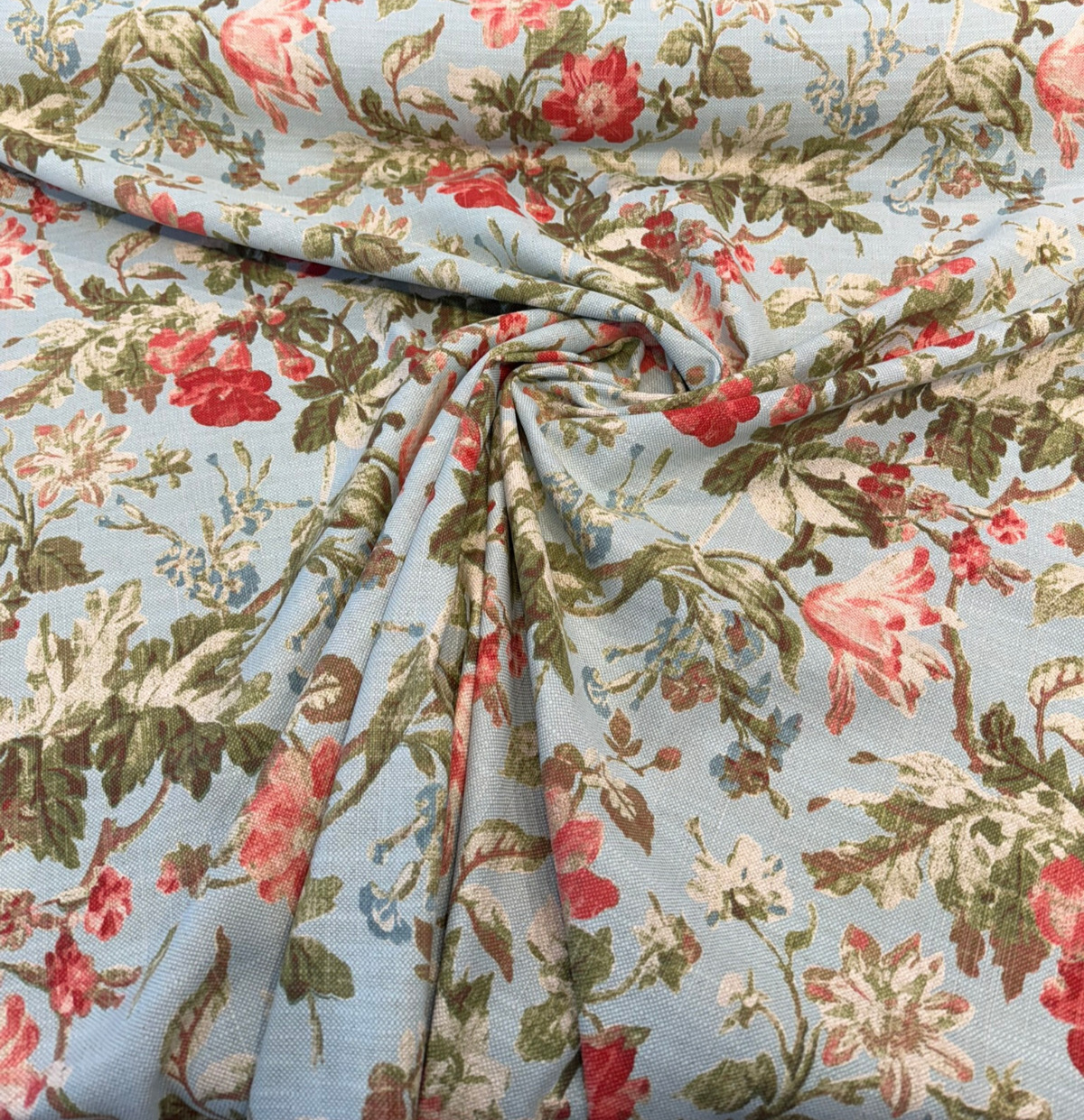 Waverly's Cosima Robins Egg offers timeless botanical beauty with an antique feel. Featuring vintage-style florals in muted reds, rose pinks, soft ivory, and sage green on a robin’s egg blue background, this fabric blends romantic charm with durability. Woven with a textured cotton-linen blend, it’s ideal for drapery, light upholstery, cushions, and decorative accents where a classic, cottage-inspired touch is desired.